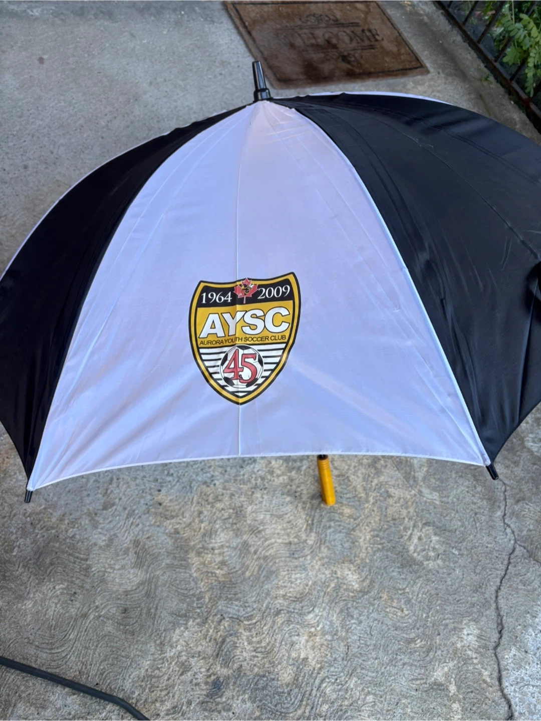 Giving a black and white umbrella featuring the AYSC (Aurora Youth Soccer Club) logo. It's in great shape and ready to keep you dry on those rainy days! 🧡 Parkside Drive south of Bloor and keele station area