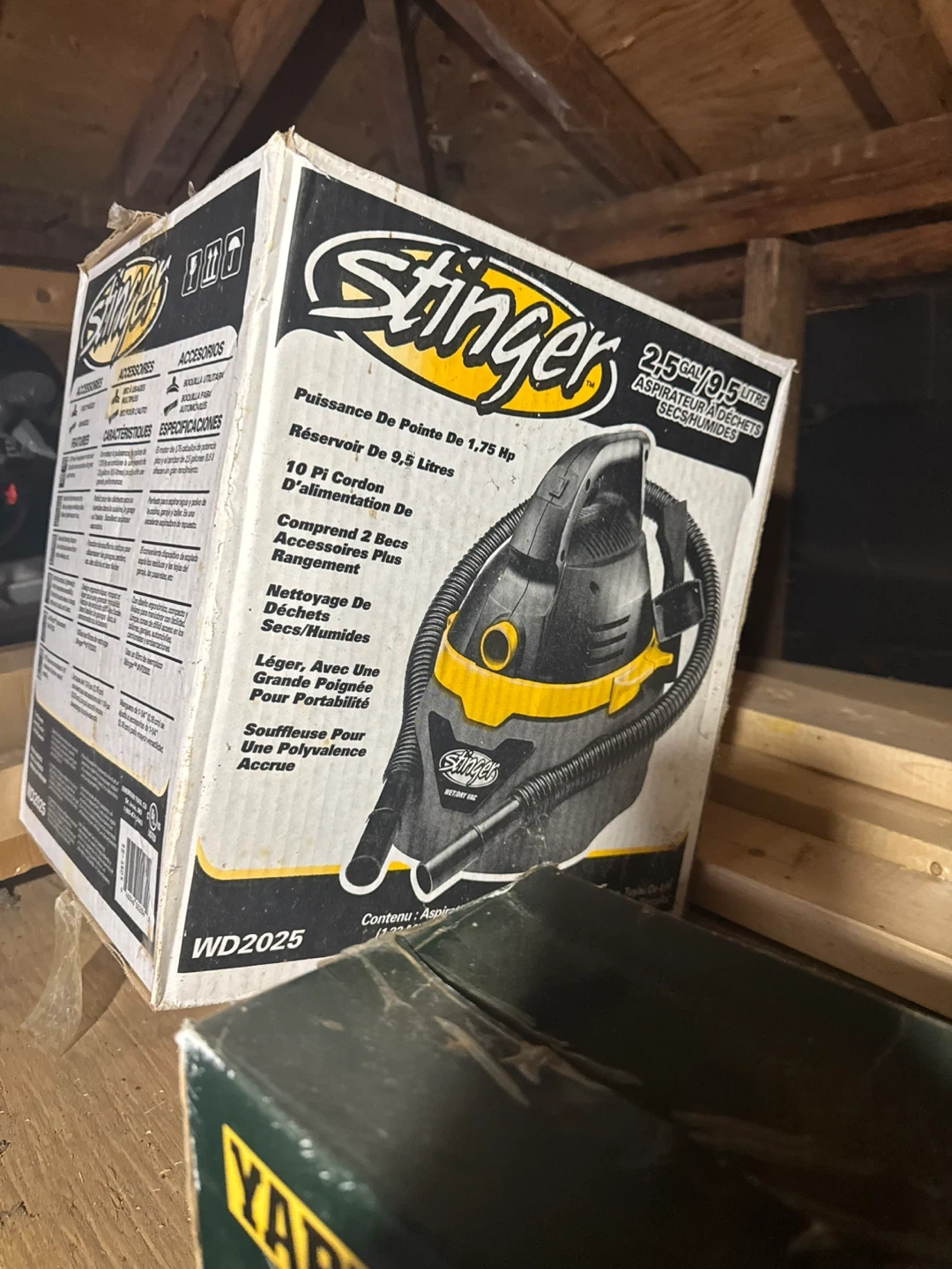 Selling a Stinger 2.5 gallon wet/dry vacuum! It has a 9.5 litre reservoir and a 1.75 HP motor. Includes a 10-foot cord and comes with two nozzles for accessories and easy storage. It's lightweight with a large handle for portability, and it can also be used as a blower for added versatility