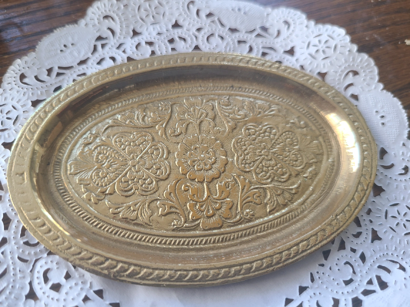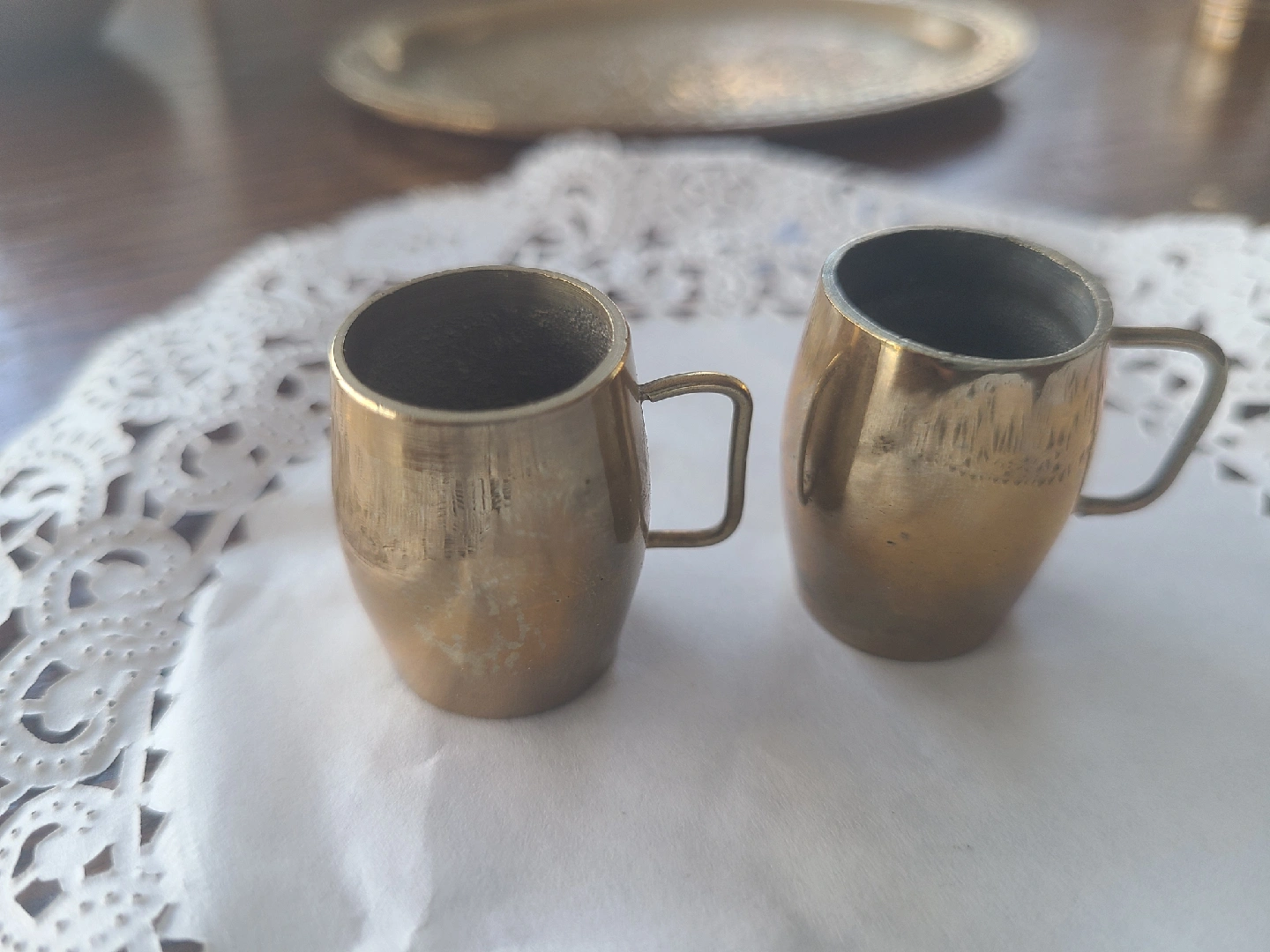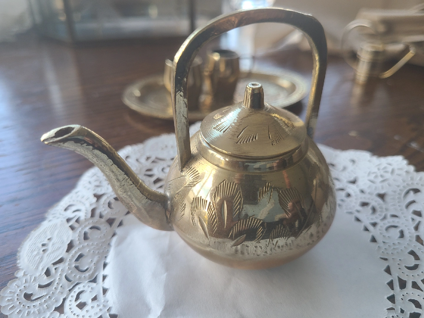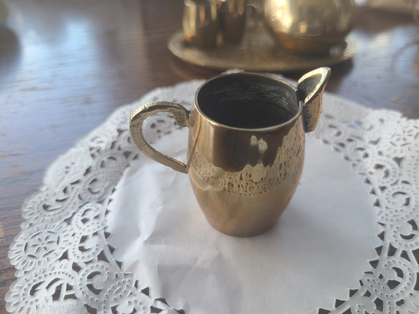 Selling a charming vintage brass tea set! It includes a teapot, a creamer, two small cups, and a decorative tray. The set has a lovely patina and intricate detailing, perfect for adding a touch of elegance to your home