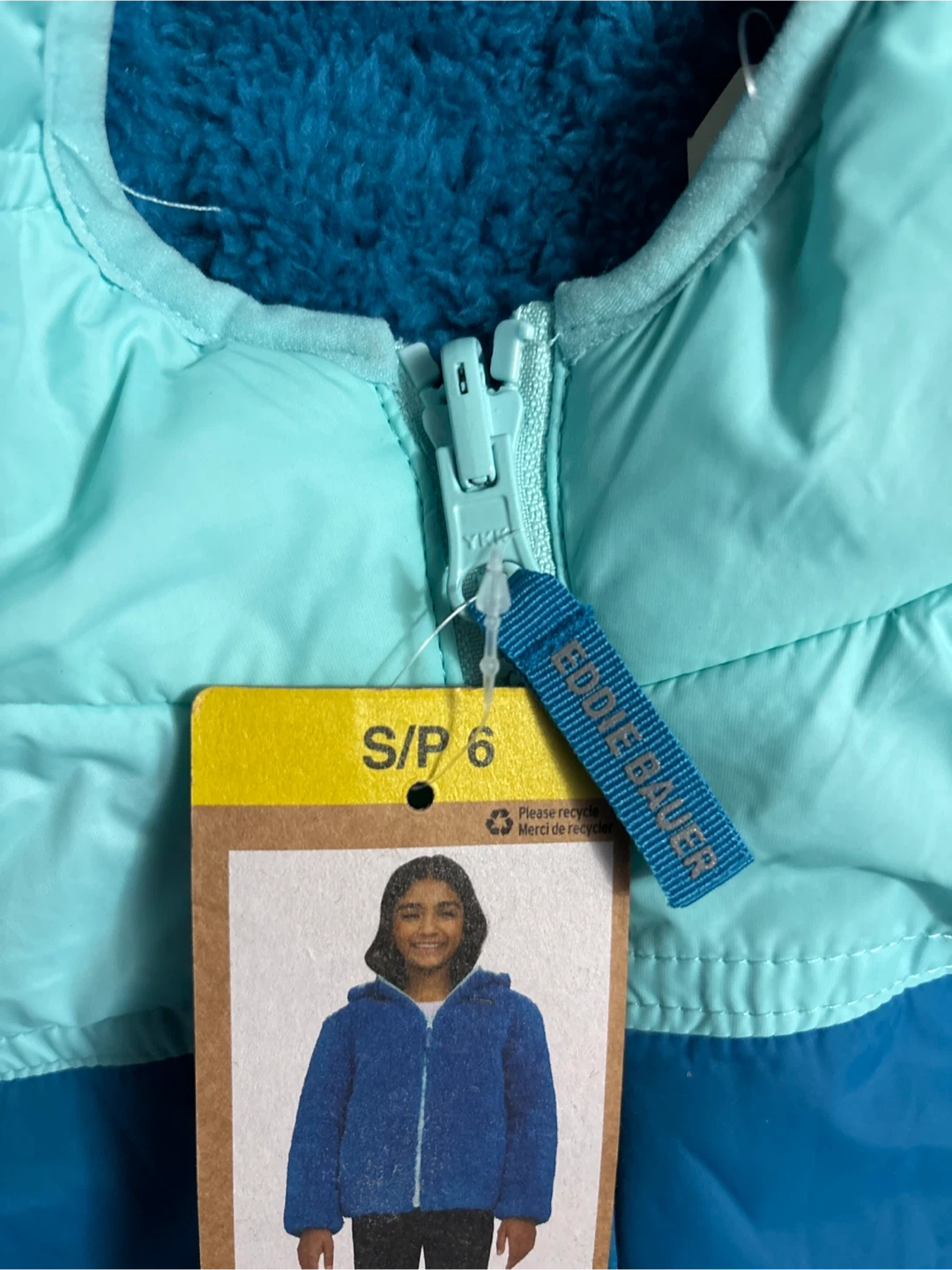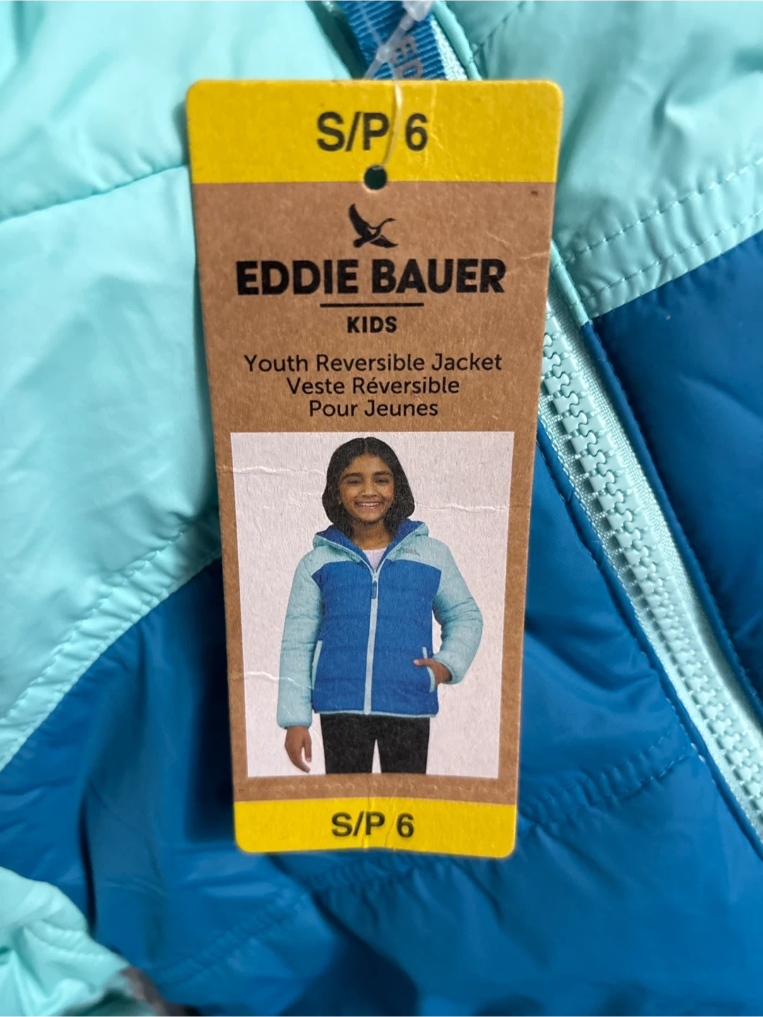 Brand new with tags, this Eddie Bauer Youth Reversible Jacket is a size 6! It's a lovely two-tone blue colour, perfect for keeping your little one warm and stylish. The jacket is reversible, offering two different looks in one!