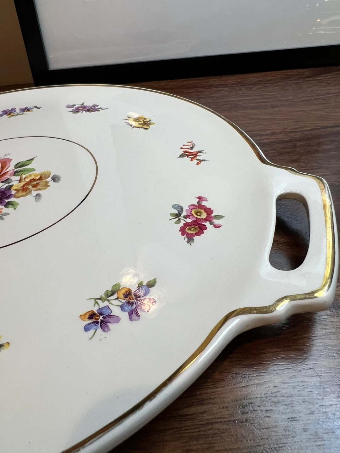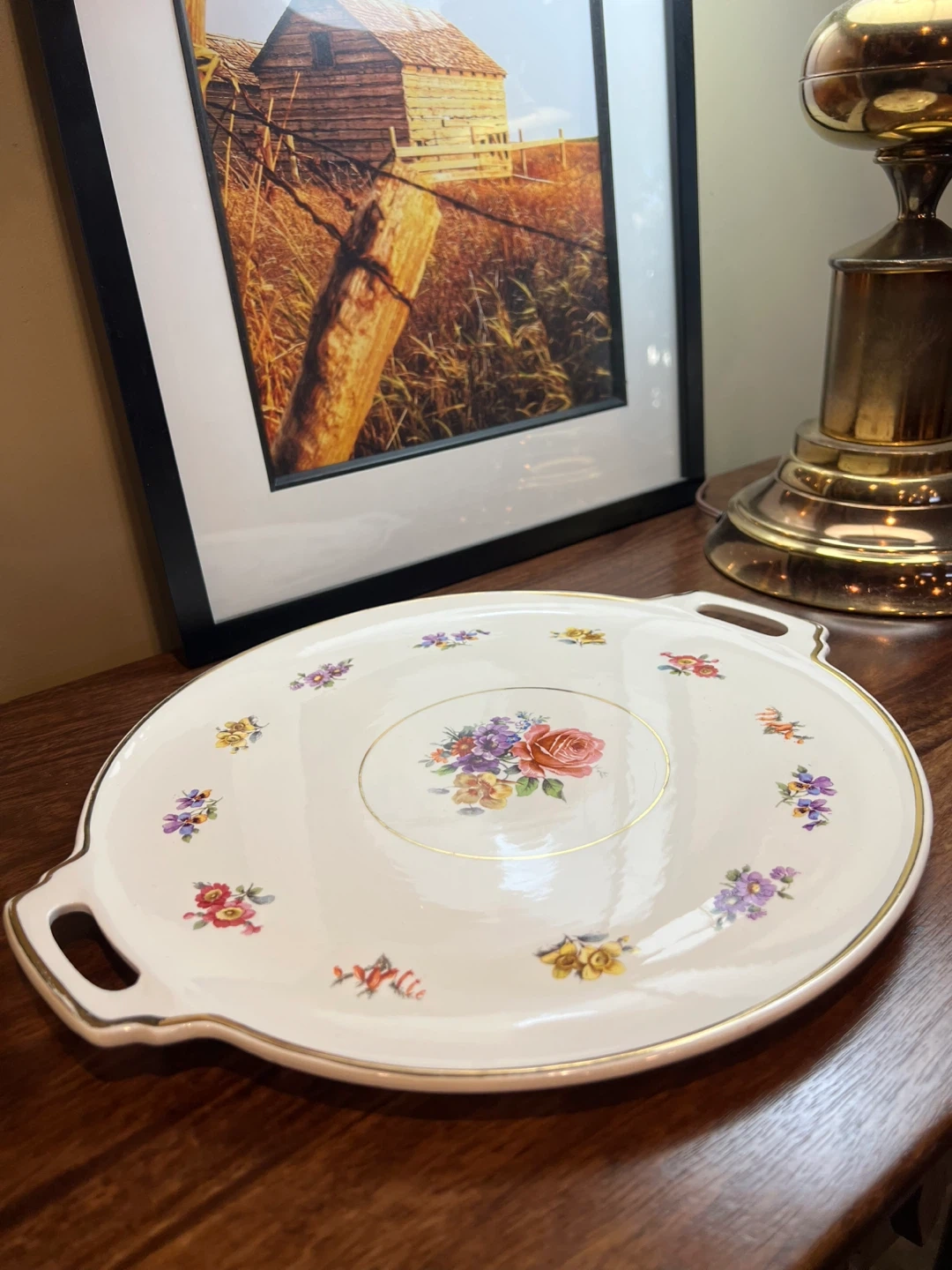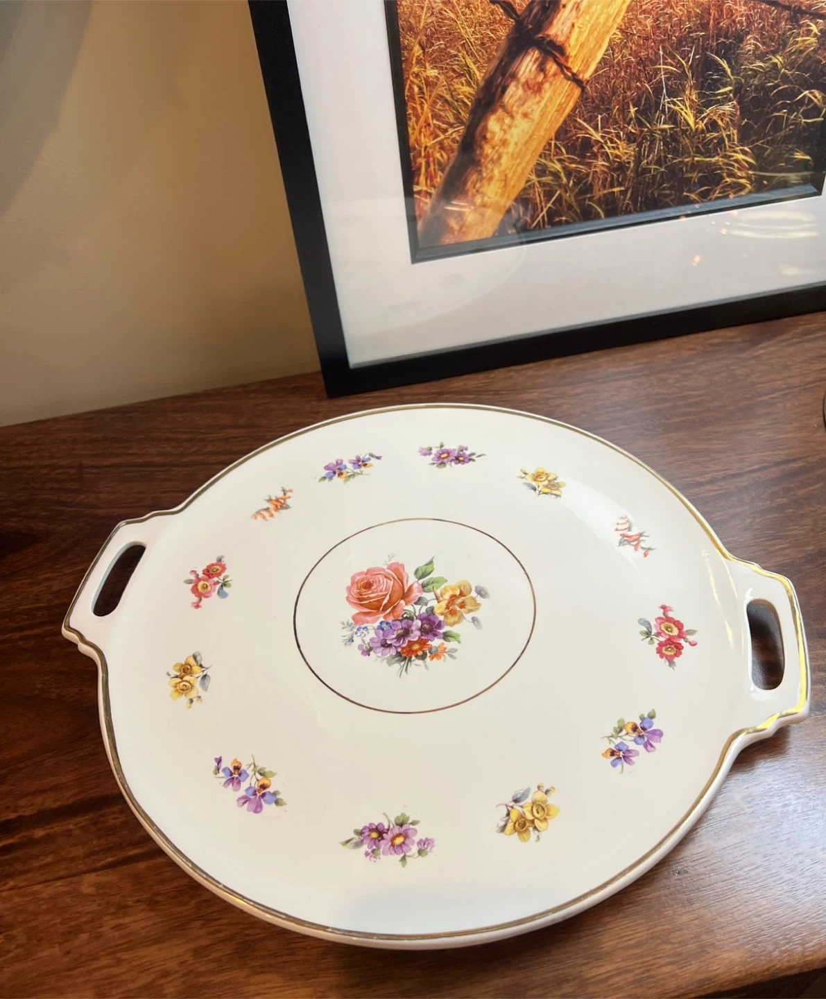Delicate floral detailing and a gold trim Stamped on the bottom Great vintage condition 14” long from handle to handle and 12” across Asking $15 Interested? Message me and please check my other listings…