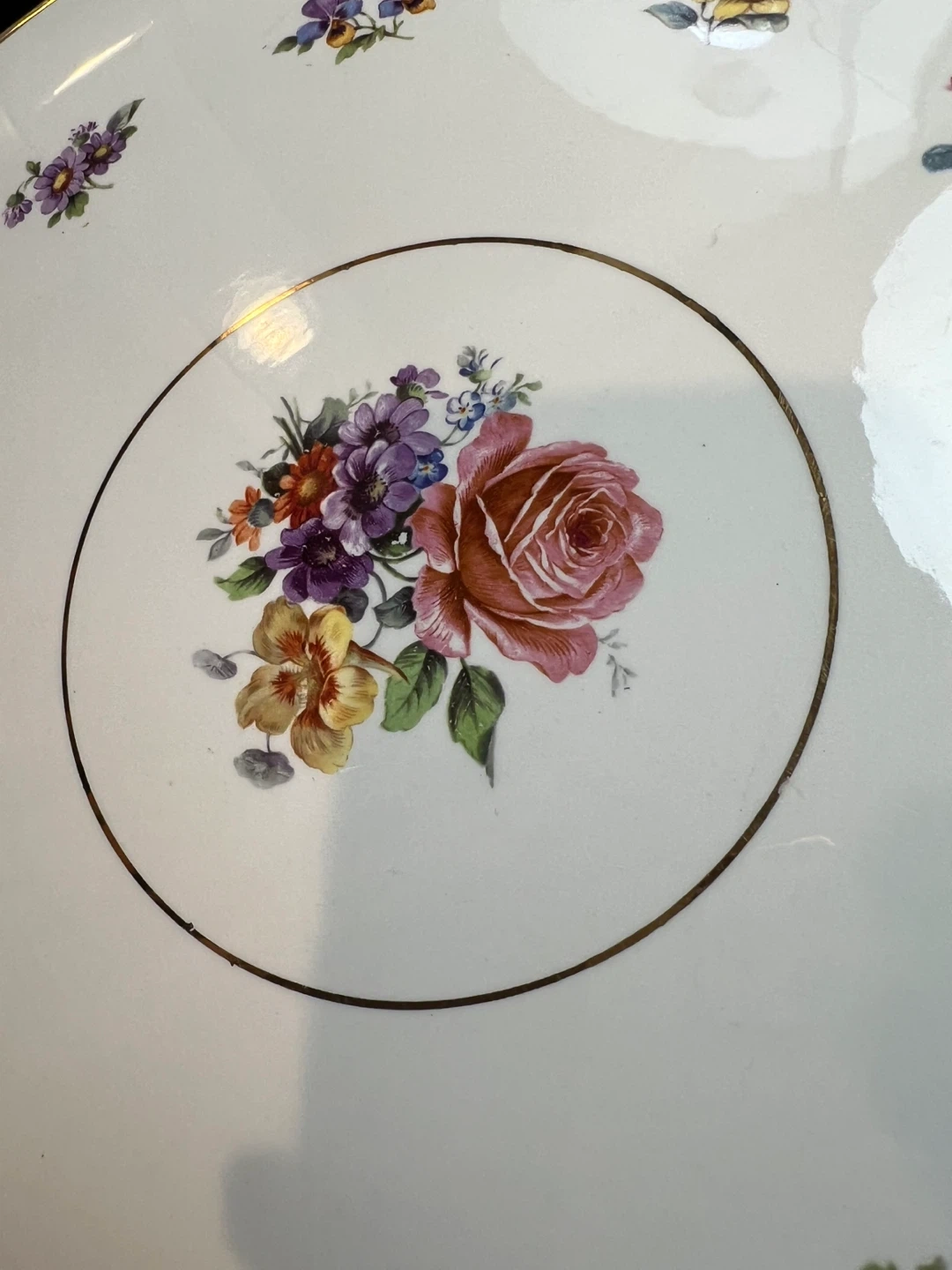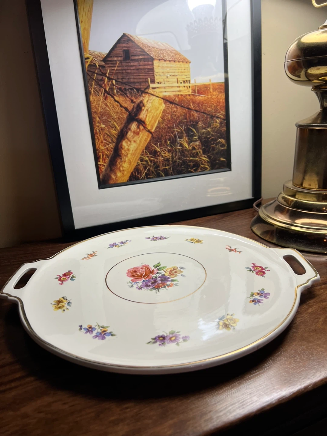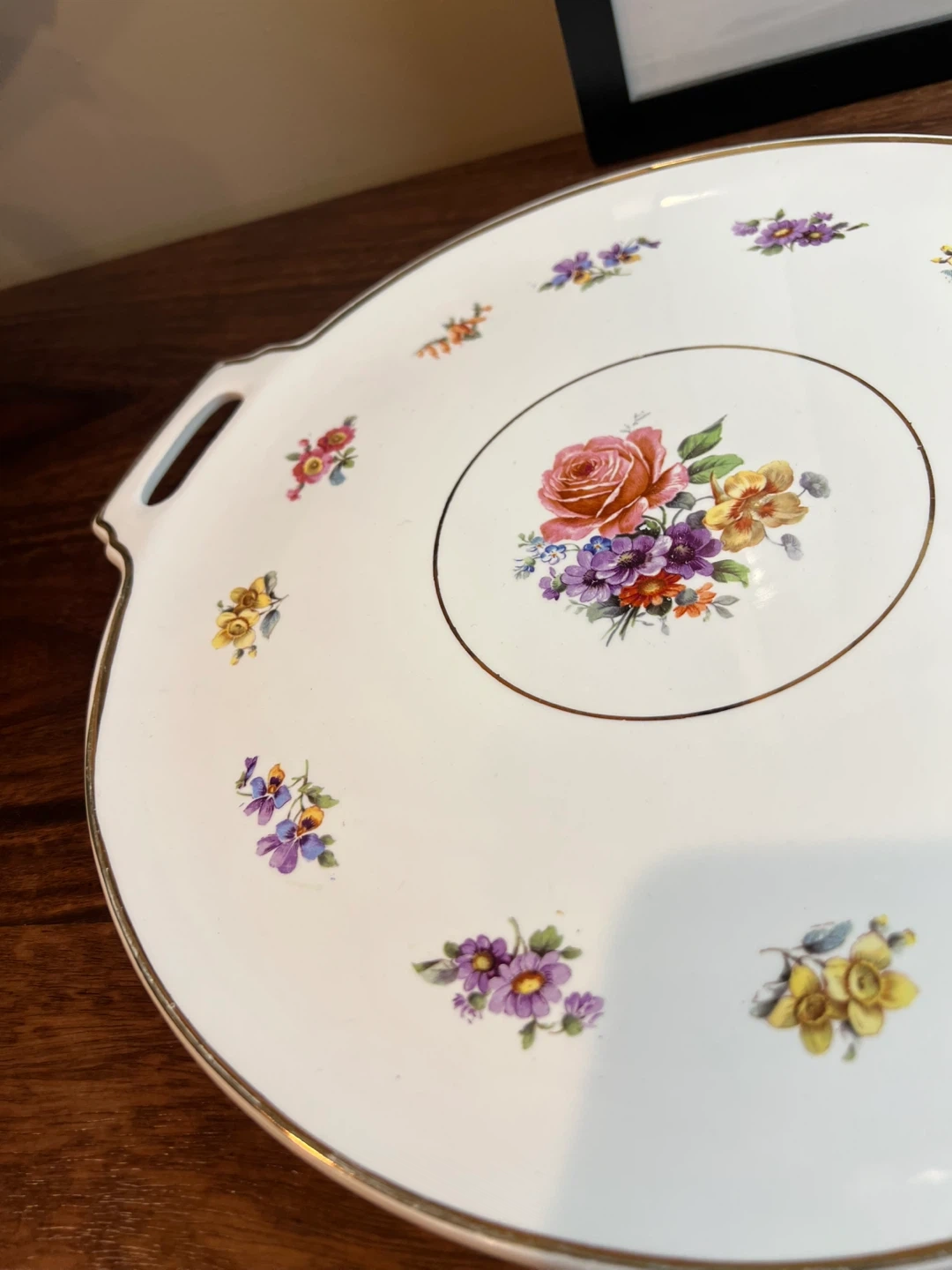 Delicate floral detailing and a gold trim Stamped on the bottom Great vintage condition 14” long from handle to handle and 12” across Asking $15 Interested? Message me and please check my other listings…