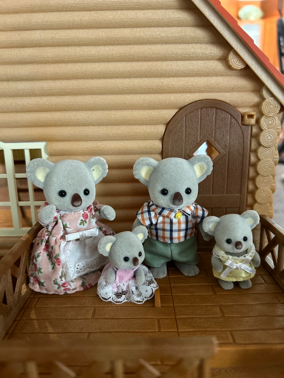 Ready for Play! Calico Critters Log Cabin Lakeside Lodge (retired) along with a Koala Family set and more! Includes everything that came with the original cabin, as well as a vintage kitchen set and accessories shown. Plus, I’m including a set of four adorable Koala figures! Connects via slide from The Adventure Tree House. Perfect for imaginative play and creating a cozy home for your Calico Critters collection.