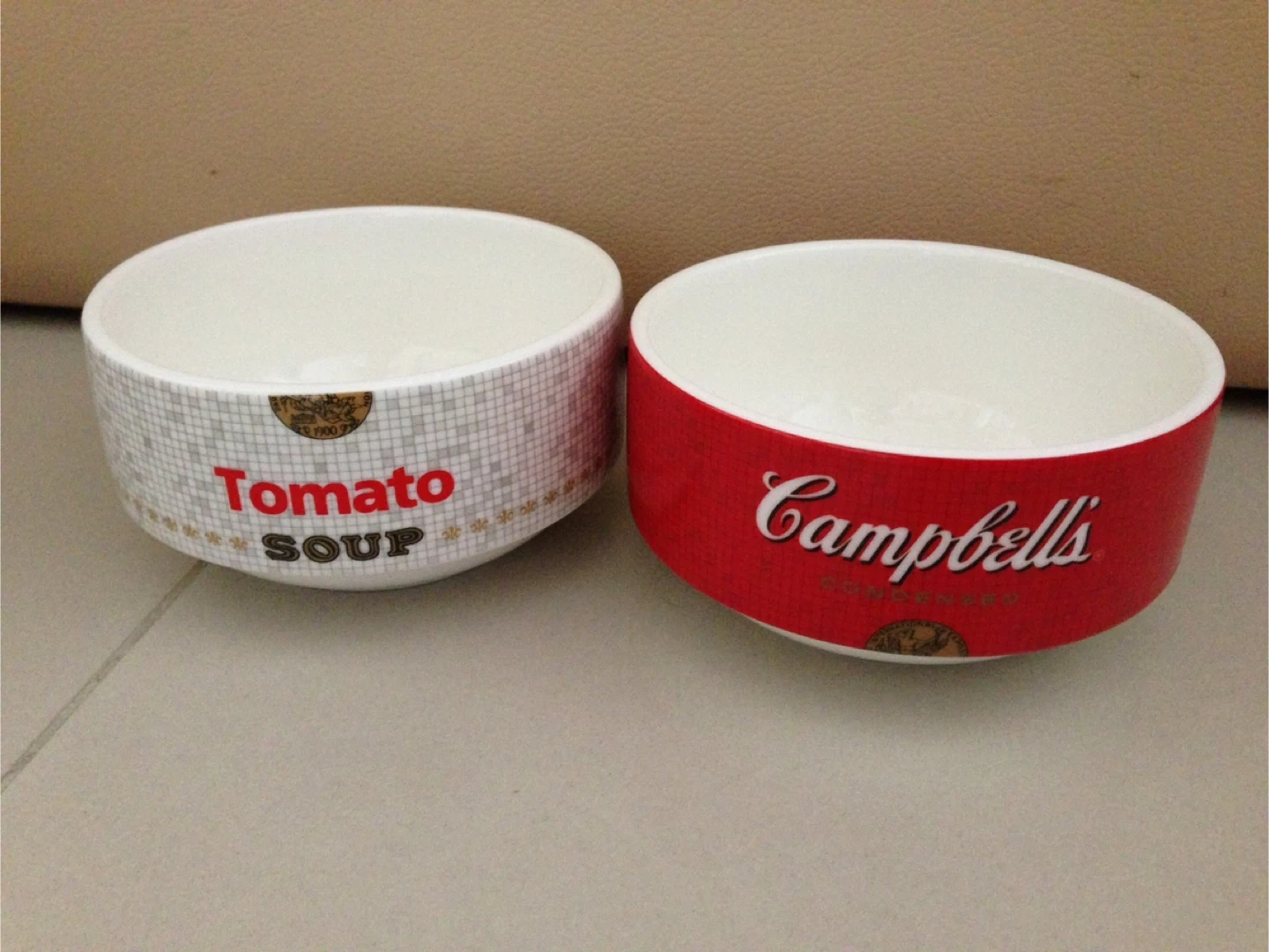 Selling a set of two Campbell's soup bowls. One is themed 'Tomato Soup' and the other simply 'Campbell's'. They're brand new
