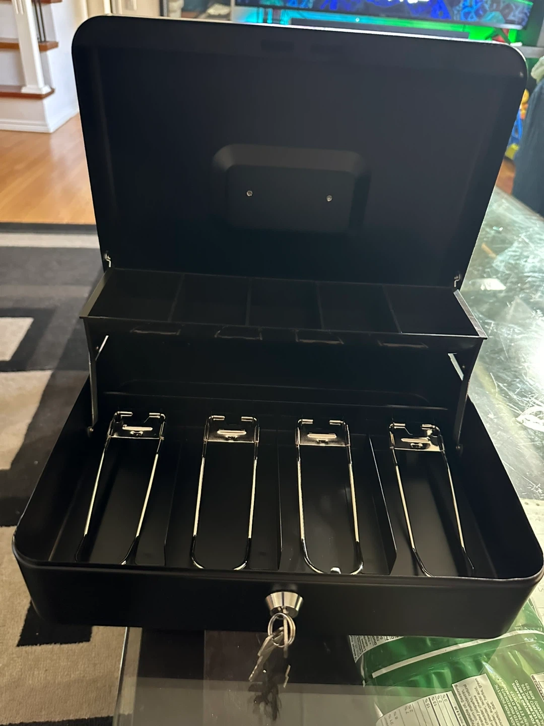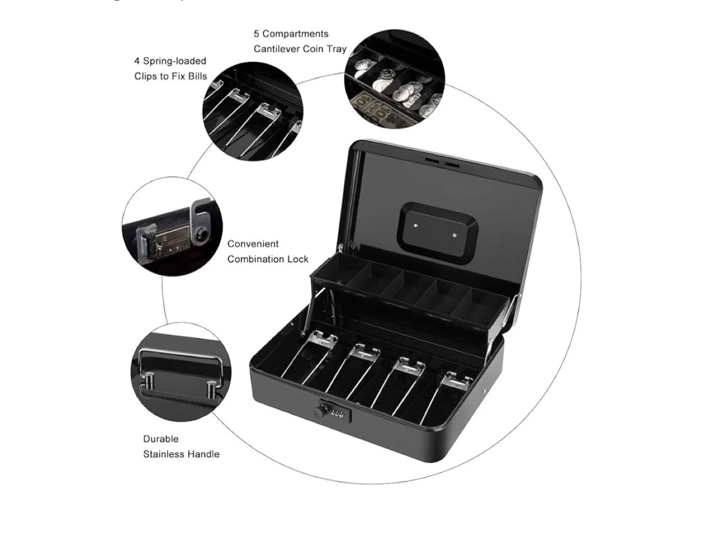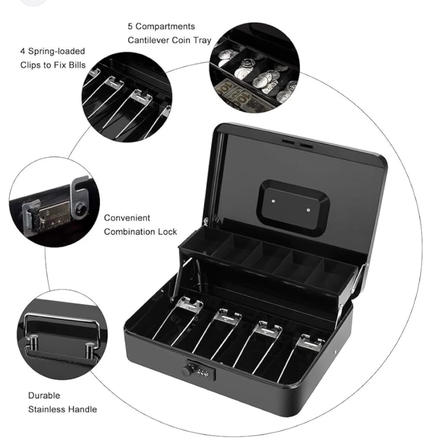Selling a black metal cash box! It has a convenient combination lock to keep your valuables safe. Features include: - 5 compartments - Cantilever coin tray - 4 spring-loaded clips to fix bills - Durable stainless handle
