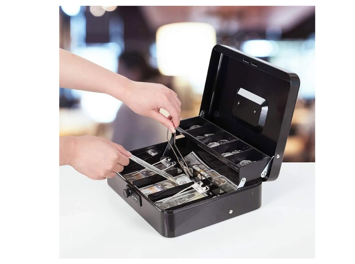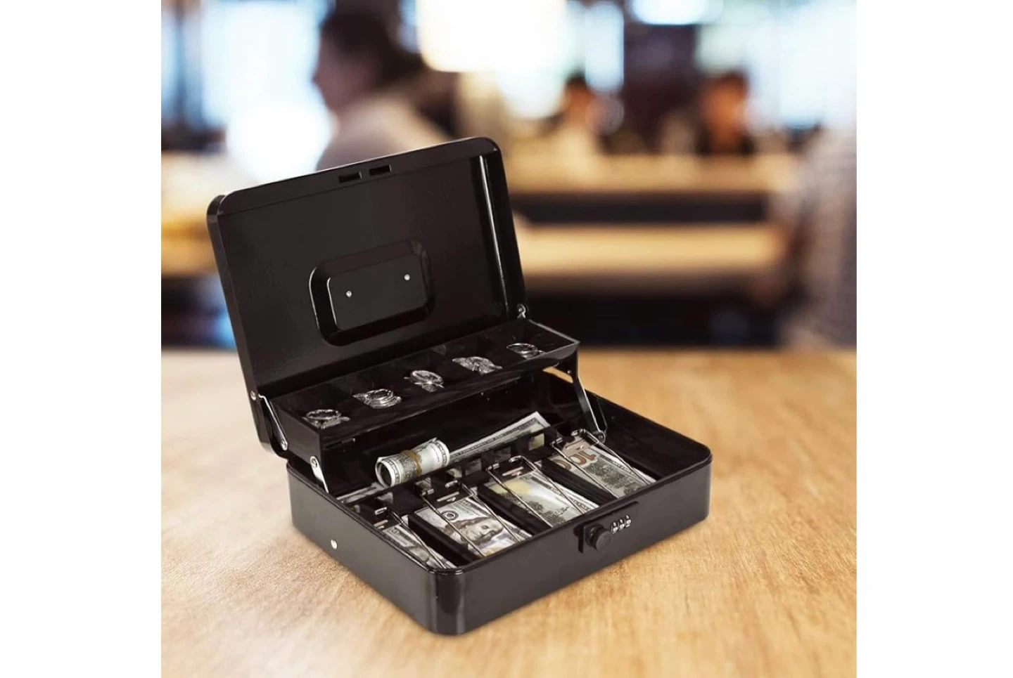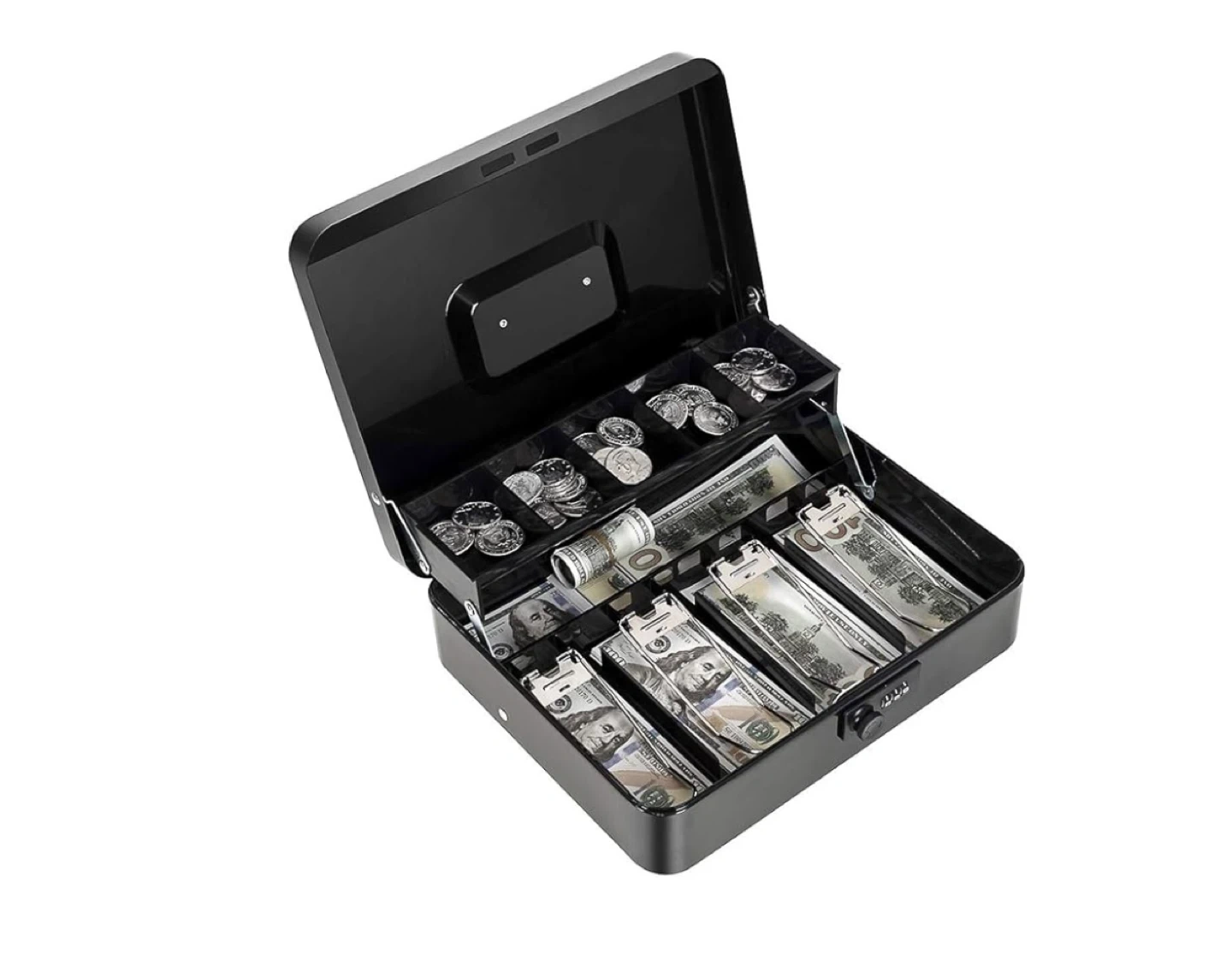Selling a black metal cash box! It has a convenient combination lock to keep your valuables safe. Features include: - 5 compartments - Cantilever coin tray - 4 spring-loaded clips to fix bills - Durable stainless handle