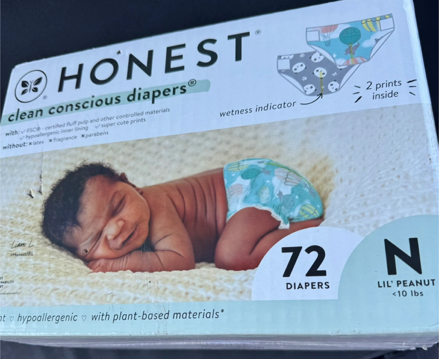 I have a pack of Honest Company diapers for sale. These are size N (Lil' Peanut, for babies under 10 lbs). The pack contains 72 diapers. They're clean conscious diapers that are absorbent, hypoallergenic, and made with plant-based materials. They also have a wetness indicator and two prints inside!