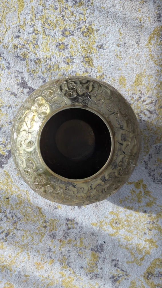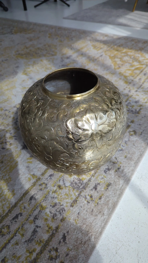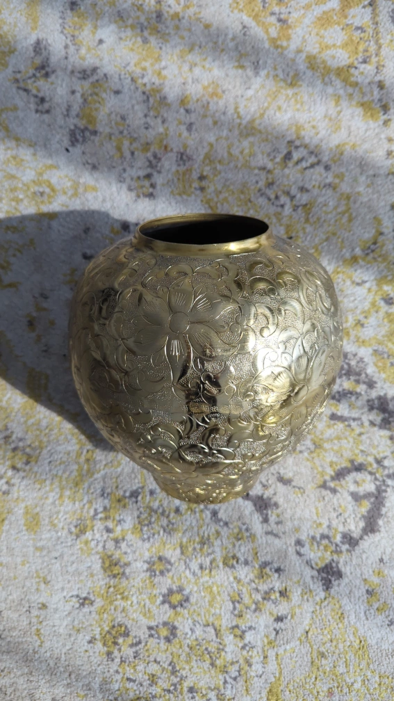 Beautiful gold vase with intricate floral designs, perfect for adding a touch of elegance to any room!