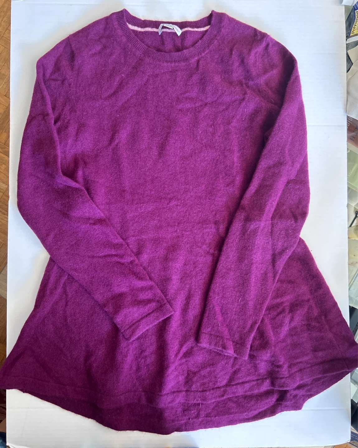 Cozy and stylish Isaac Mizrahi LIVE sweater made from 100% cashmere! It's a beautiful dark purple colour and There are a couple of small snags, located at the top back neck area near the label as pictured. Please check out the photos. Smoke/Pet free home. Cash/Pick up only.
