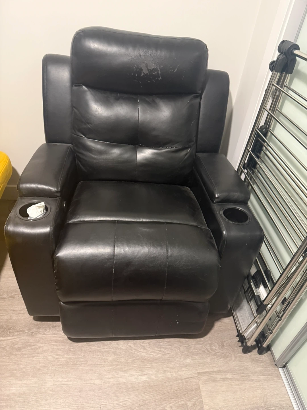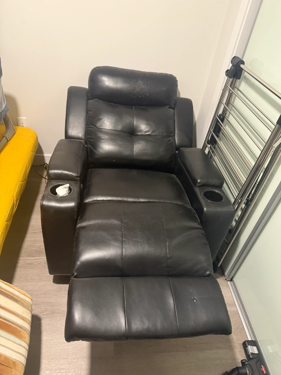 Selling a comfy black leather recliner chair. It's perfect for relaxing after a long day. It has a few signs of wear, but it's still in good condition and very functional. Has cup holders on both sides too!