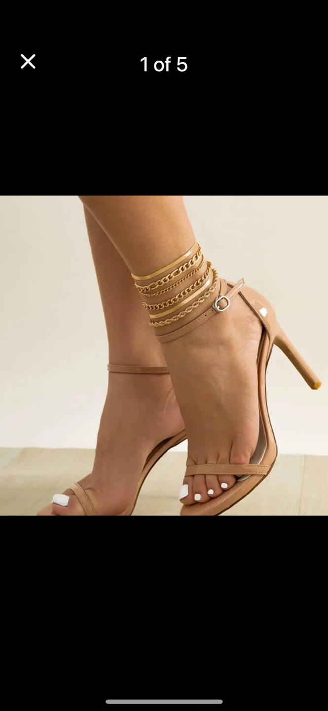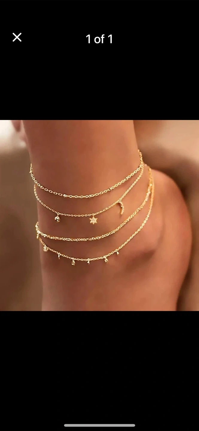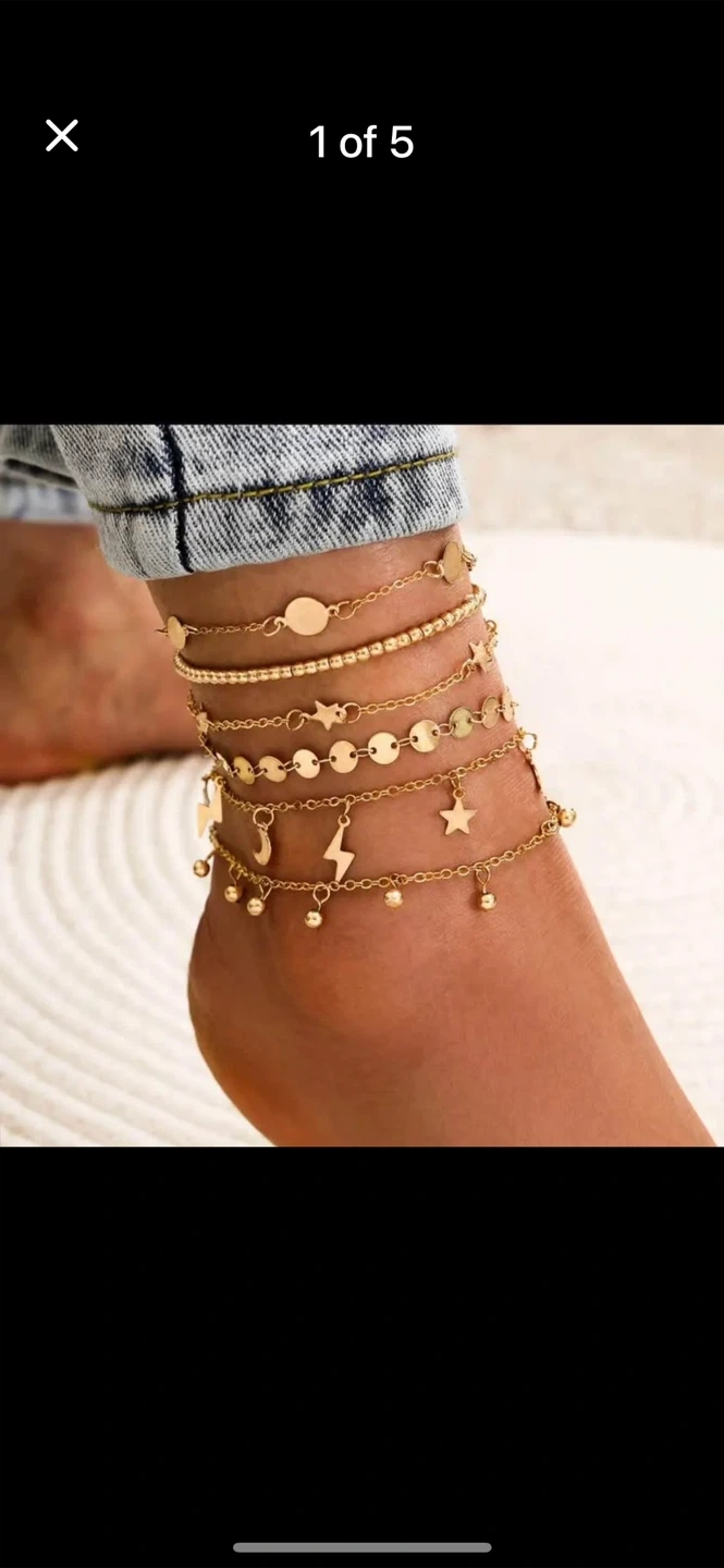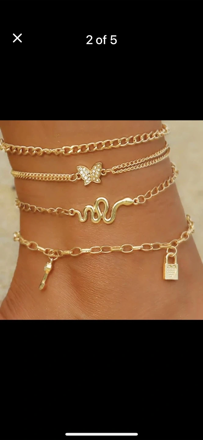 Check out this cute set of gold-tone anklets! Perfect for adding a little sparkle to your summer outfits. They feature different chain styles and charms. Great condition!