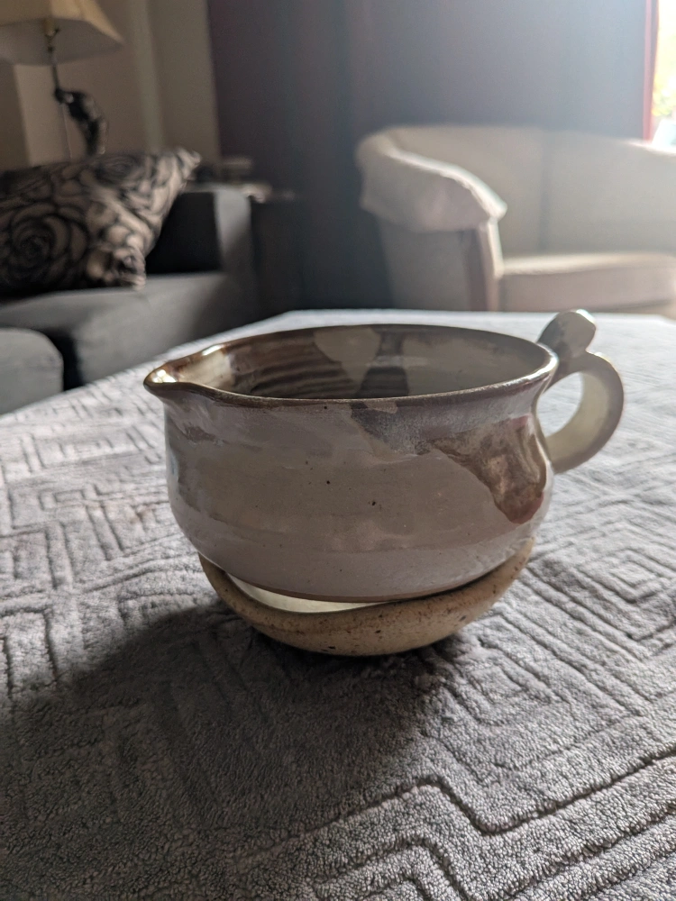 Selling a handmade ceramic bowl and plate set...gravy set. The bowl has a unique spout and handle, and the plate is a small, shallow dish. Both pieces have a beautiful, rustic glaze in earthy tones. Perfect for adding a touch of artisanal charm to your kitchen or dining table. pickup location Oxford and Wonderland FCFS cross posted please checkout my other listings