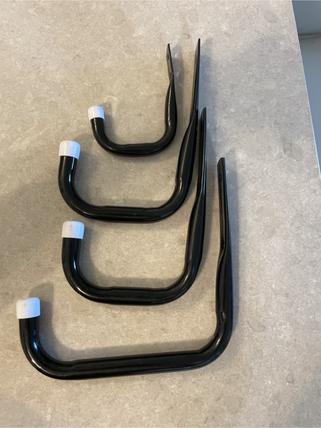 Selling a set of four garage storage hooks. They're perfect for organizing your garage or shed! They're black metal with white caps. Great for hanging tools, bikes, or other equipment to keep your space tidy
