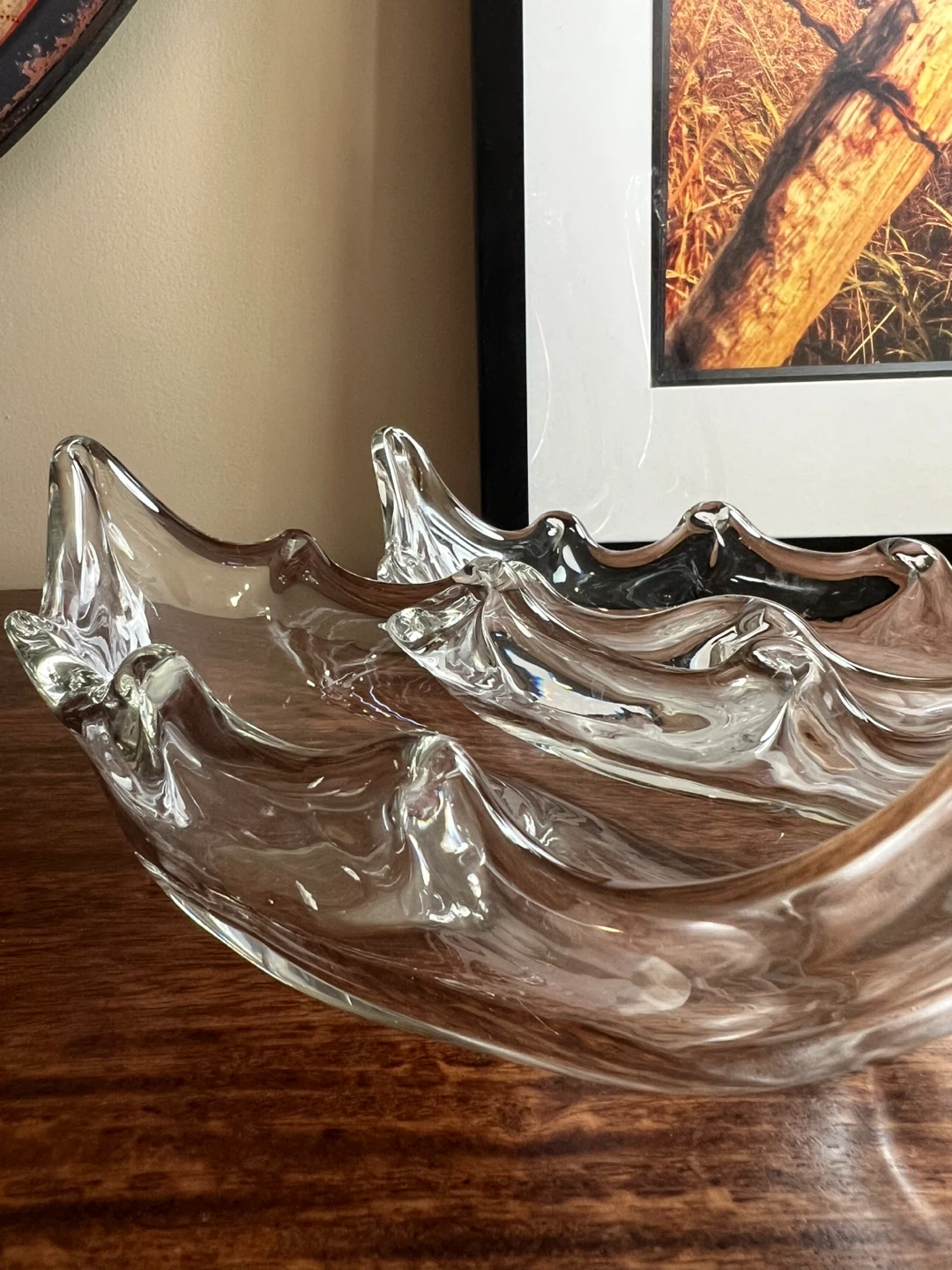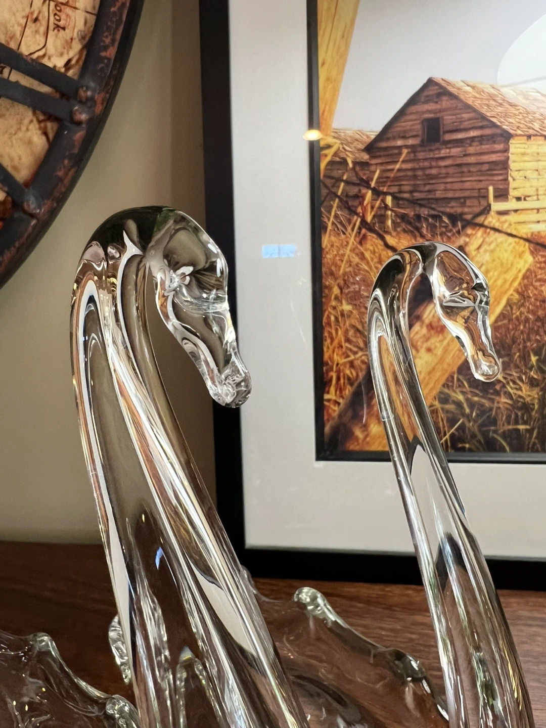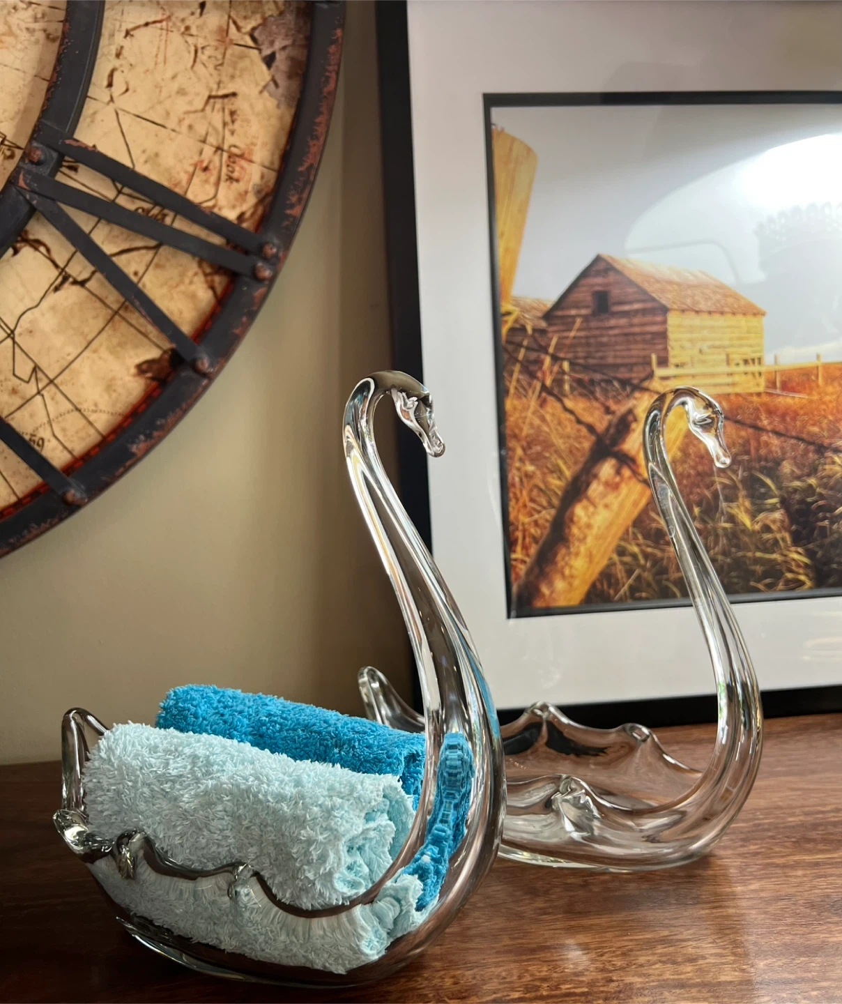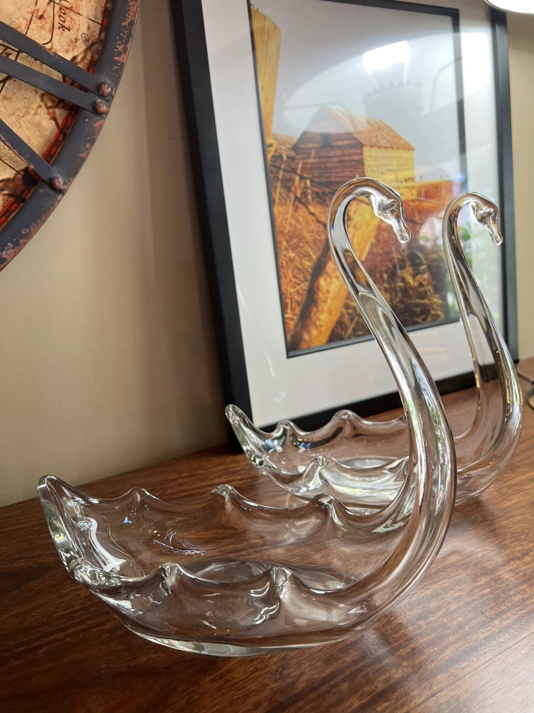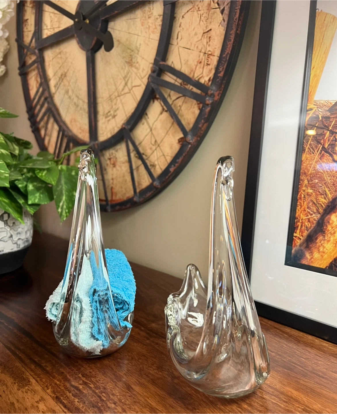 Set of 2 Clear glass Can be used for hand towels, to hold trinkets, jewelry, candy etc… Perfect as standalone art too!! Great condition Approximately 9.5” tall, 8.5” long and 3.75” wide Asking $15 for both/Sold as a set Interested? Message me and please check my other listings…