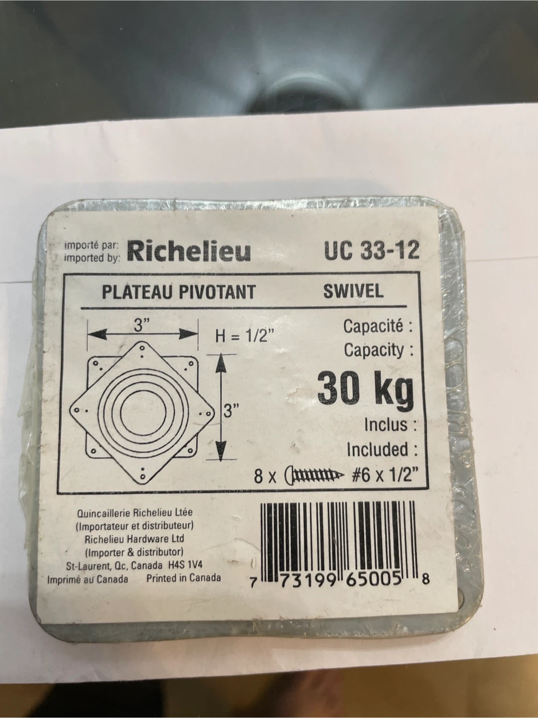 Selling a brand new Richelieu UC 33-12 swivel plate, still sealed in its original packaging! It's a 3-inch swivel with a height of 1/2 inch and a capacity of 30 kg. Included are 8 screws, size #6 x 1/2". Perfect for your DIY projects or furniture upgrades!
