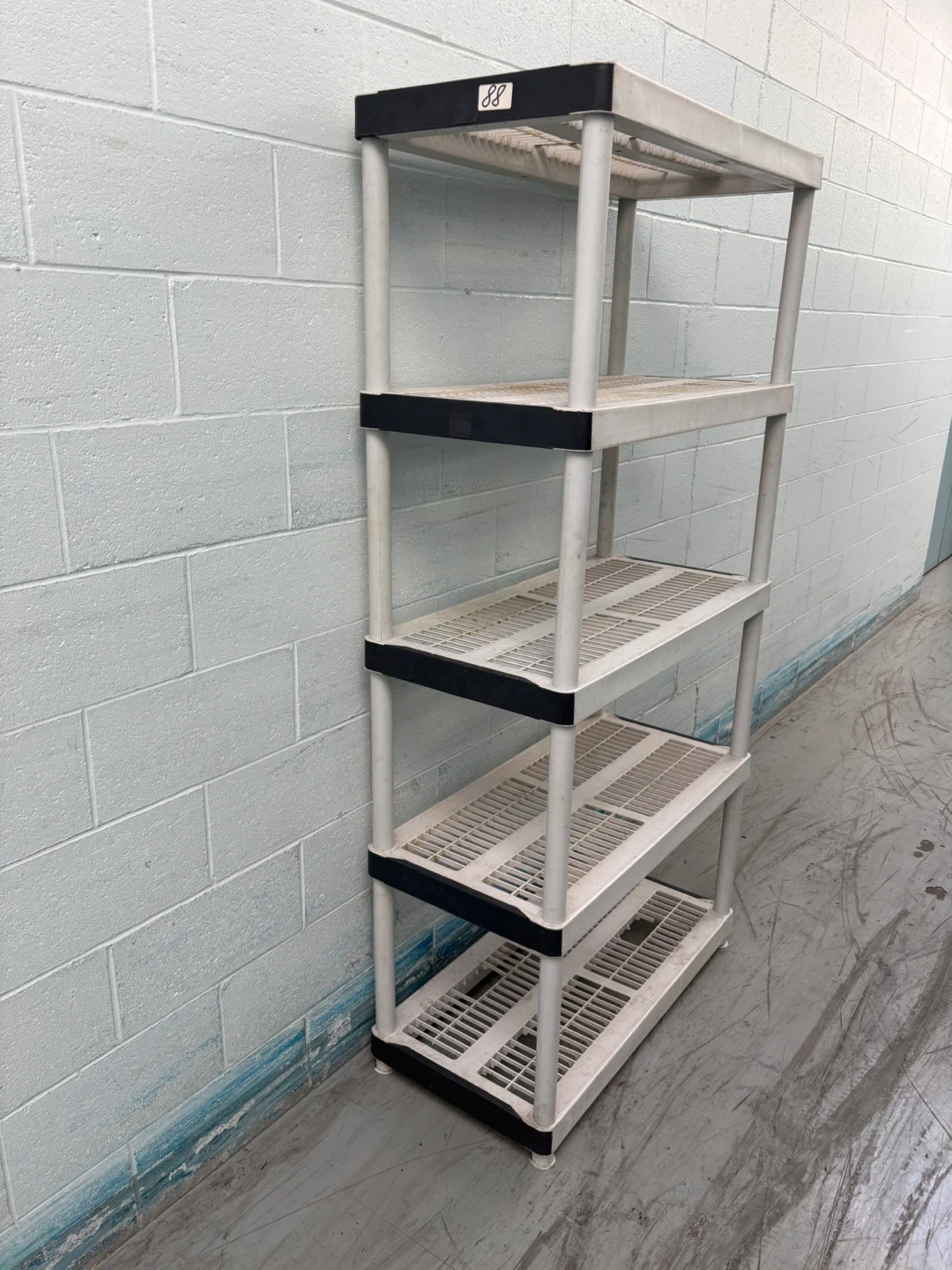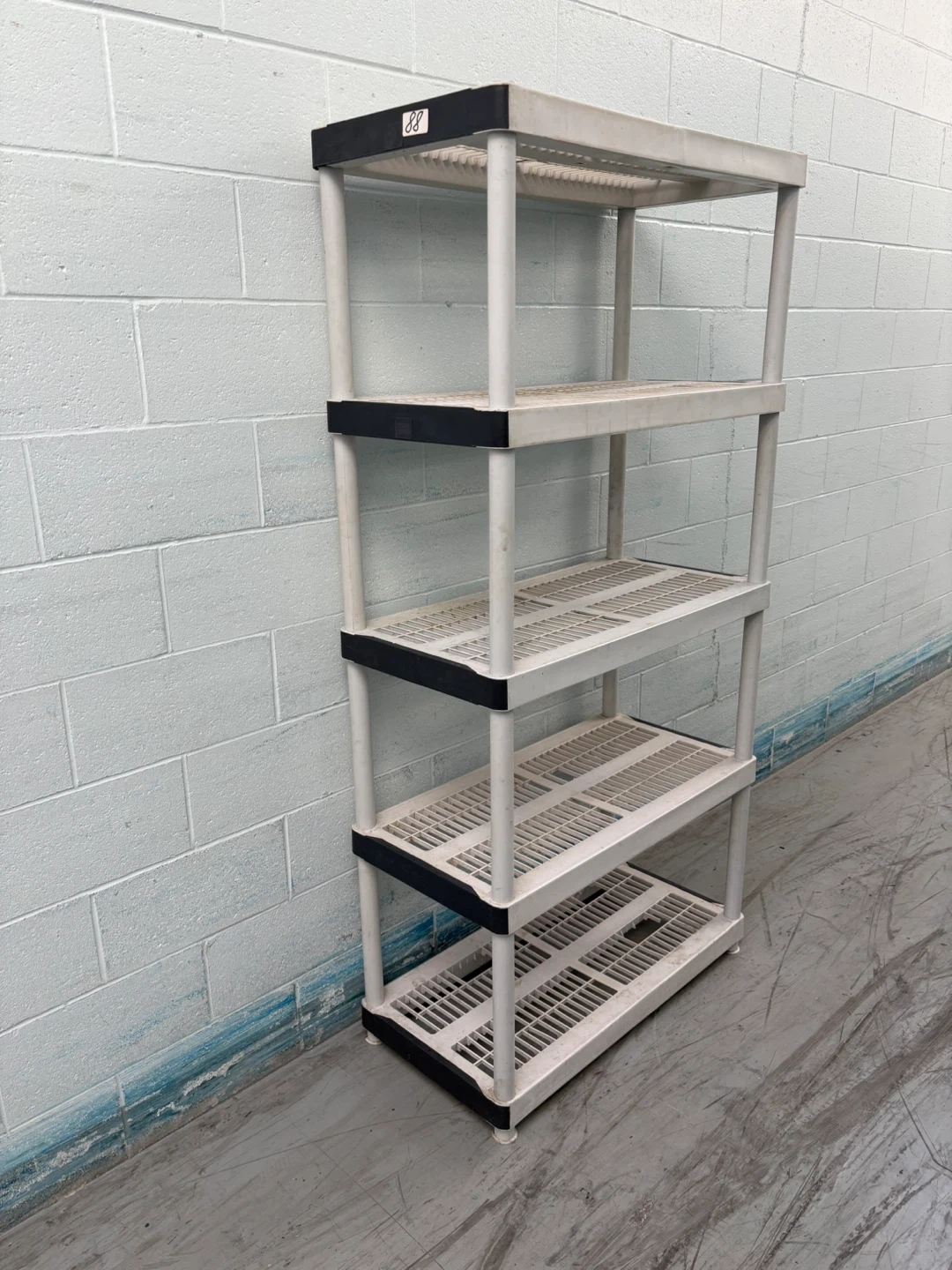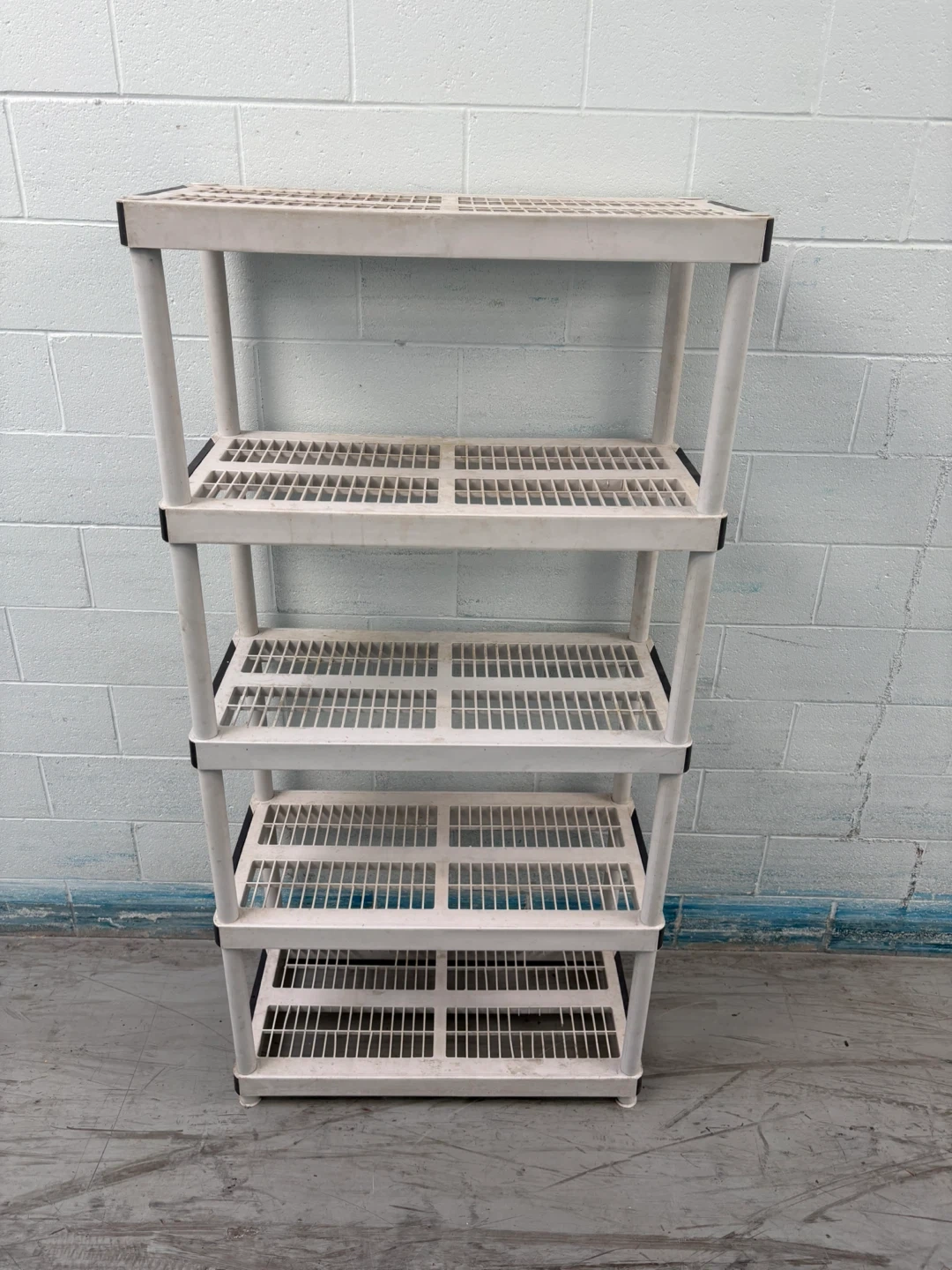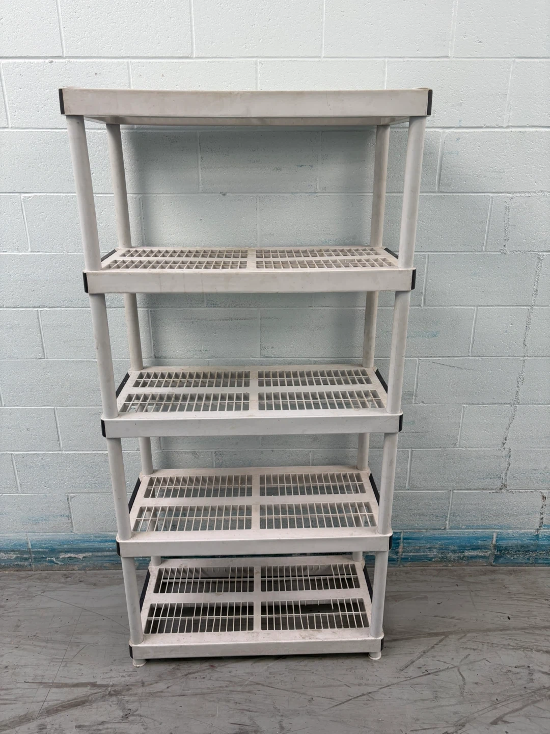 🧡okay condition 5-Tier Plastic Shelf Unit Selling a handy 5-tier plastic shelf unit! It's great for organizing items in your garage, basement, or storage room. It is in used condition well loved some ware Measurements in last couple of pics $10 Pick up Victoria Park & O’Connor area