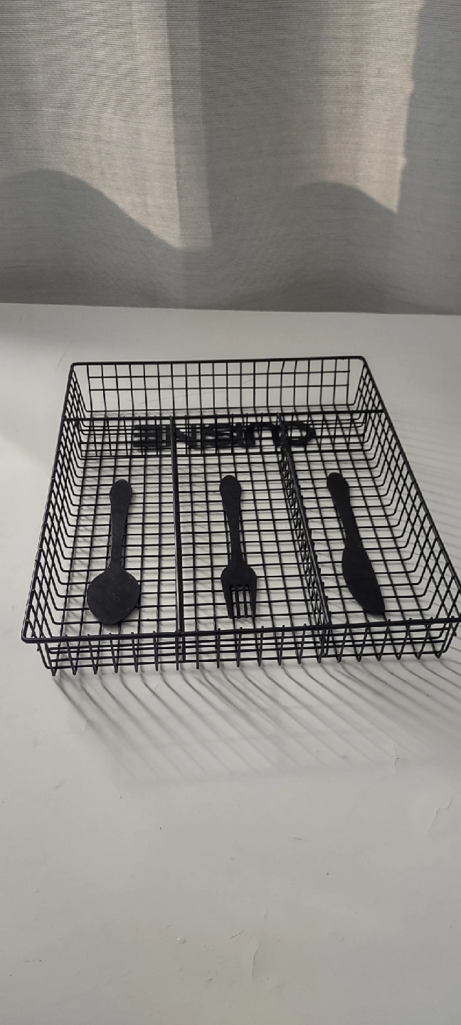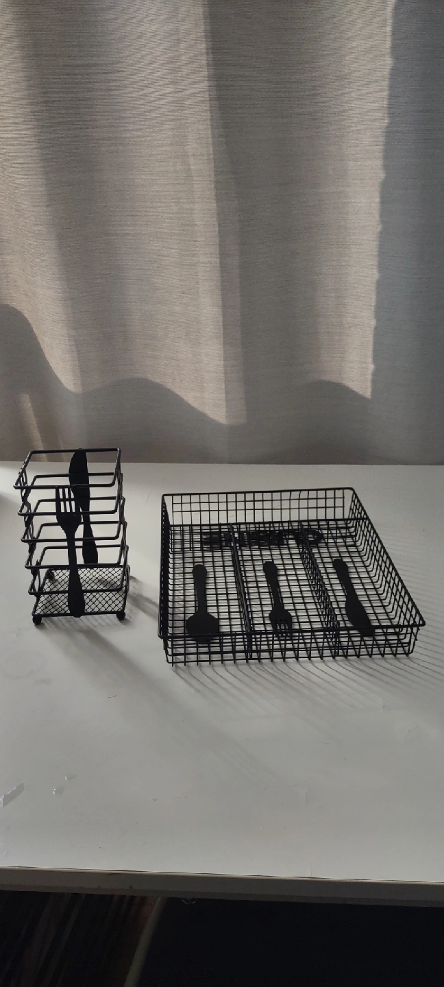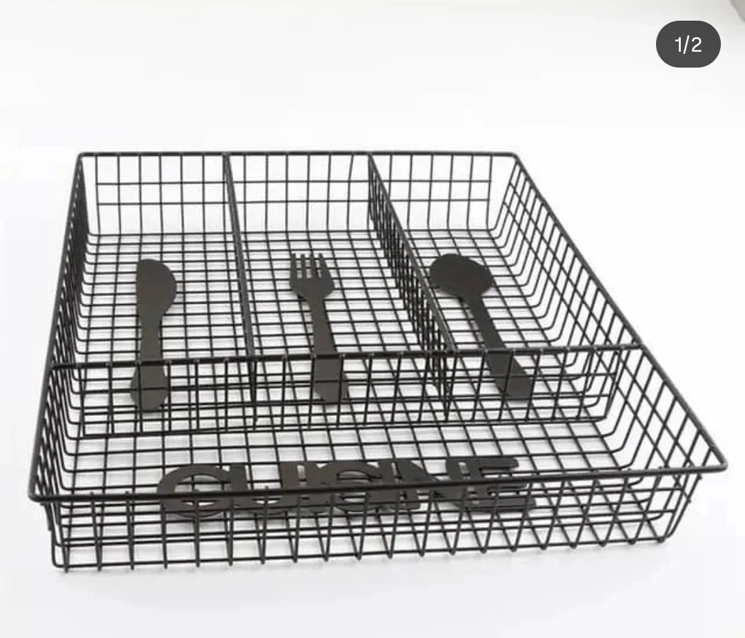 Declutter your kitchen drawers with this handy black wire cutlery organizer! It’s perfect for keeping your spoons, forks, and knives neatly separated and easy to find. This organizer is in great condition and ready to bring some order to your kitchen. never used. Large : W 12.5 X 10.5 inches Small : W 4 X 6.5 inches both $15
