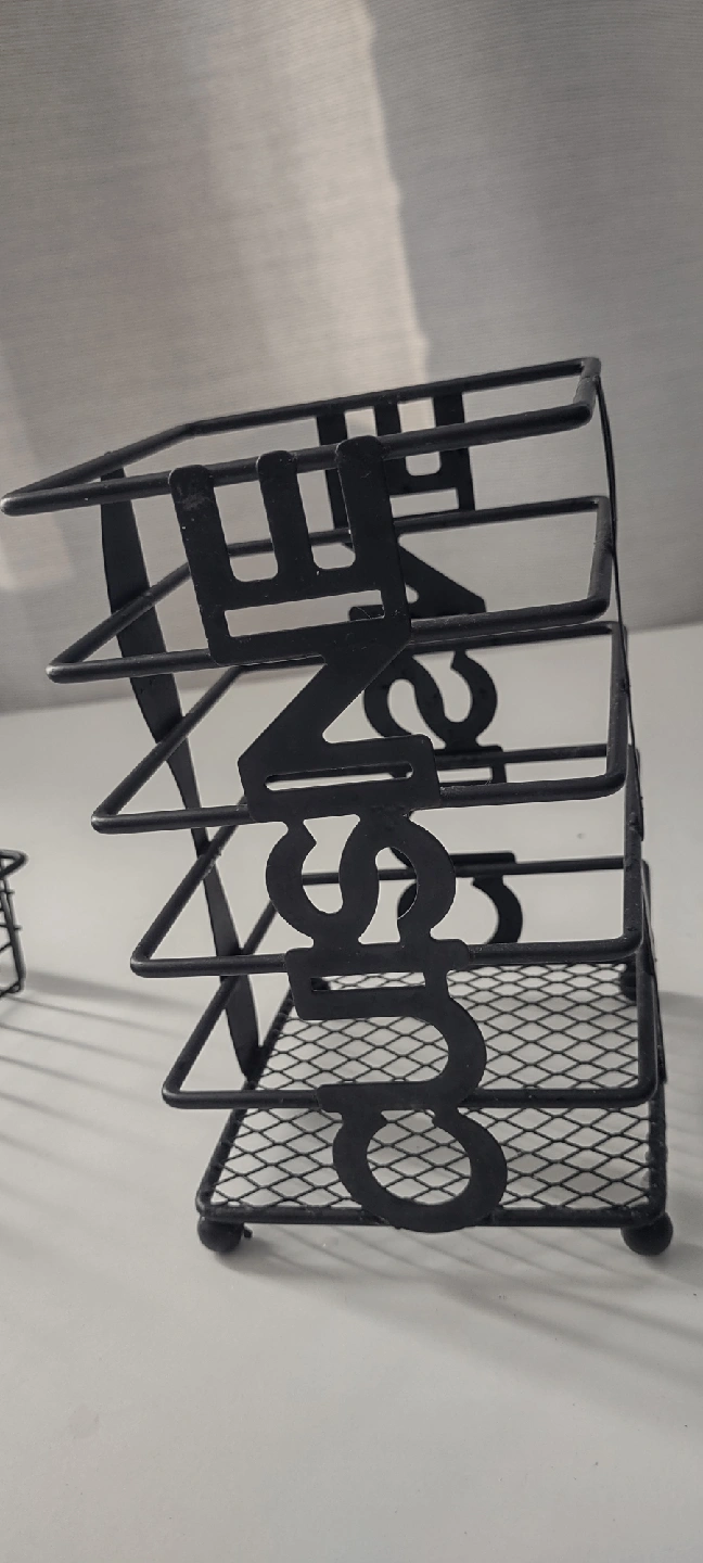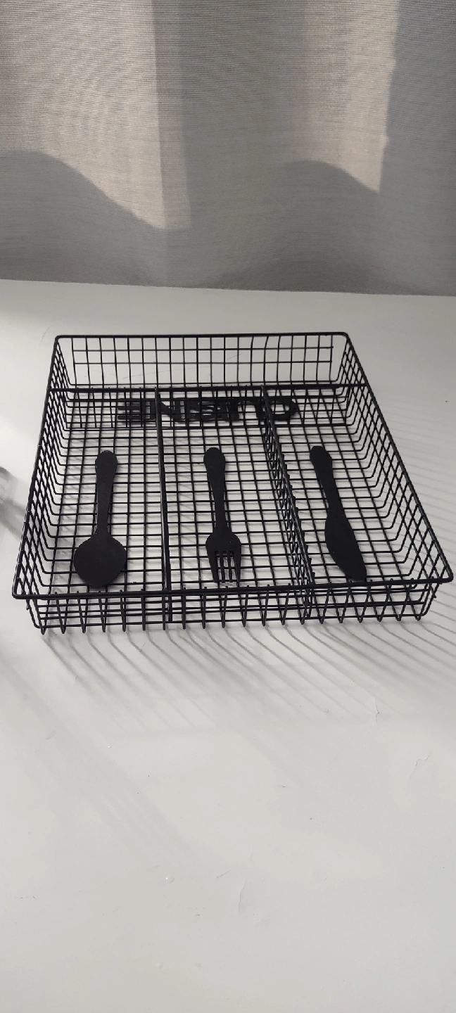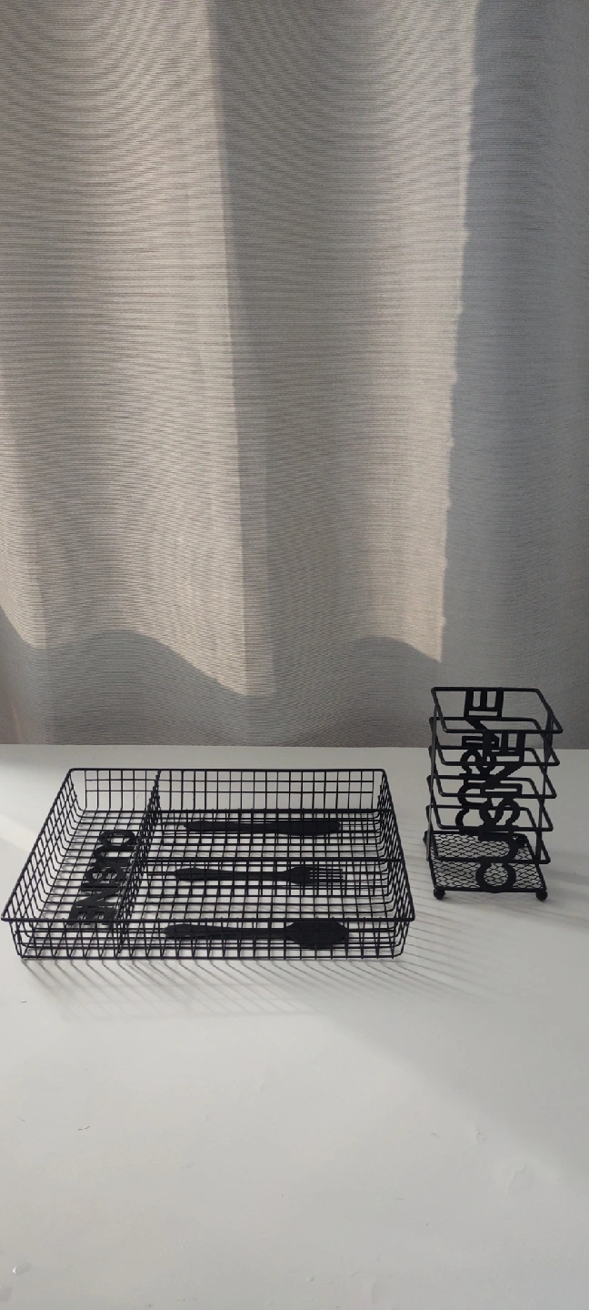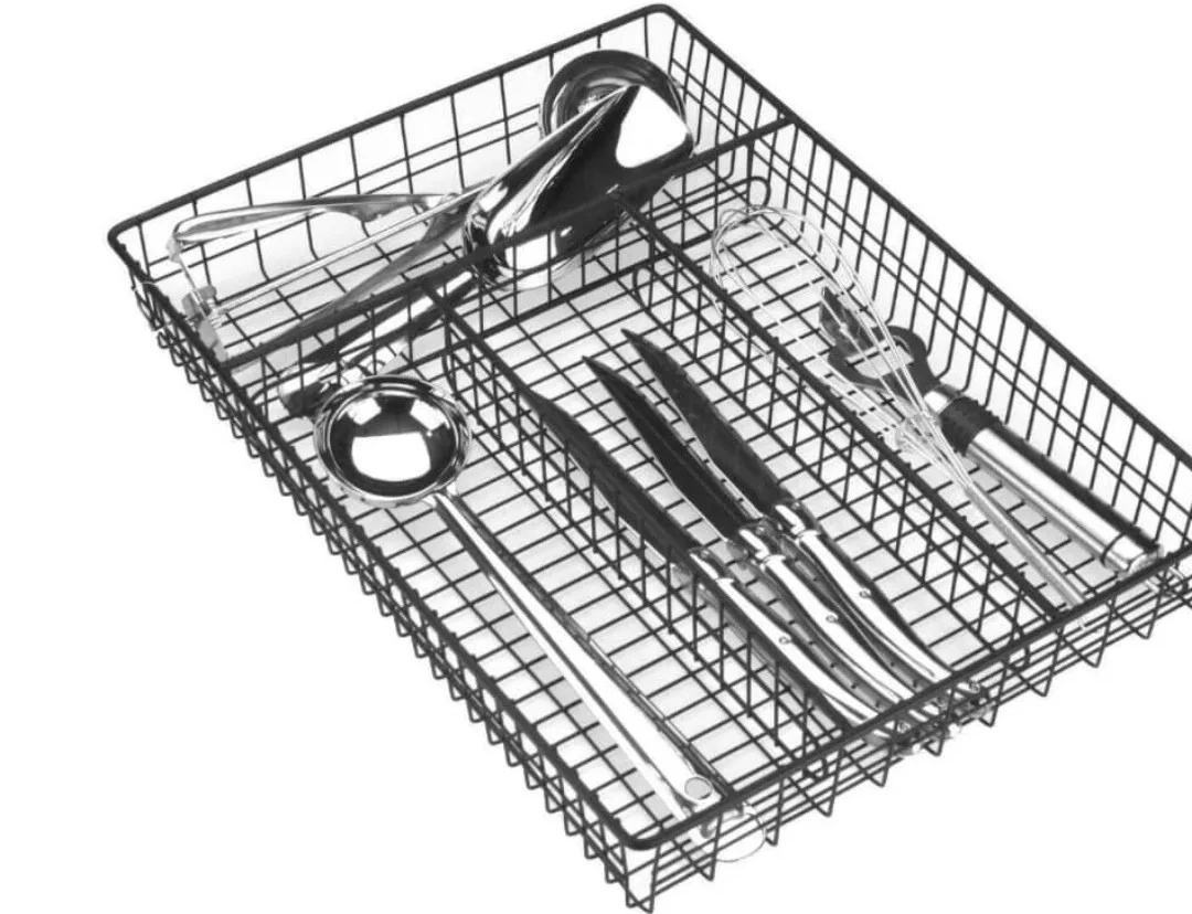 Declutter your kitchen drawers with this handy black wire cutlery organizer! It’s perfect for keeping your spoons, forks, and knives neatly separated and easy to find. This organizer is in great condition and ready to bring some order to your kitchen. never used. Large : W 12.5 X 10.5 inches Small : W 4 X 6.5 inches both $15