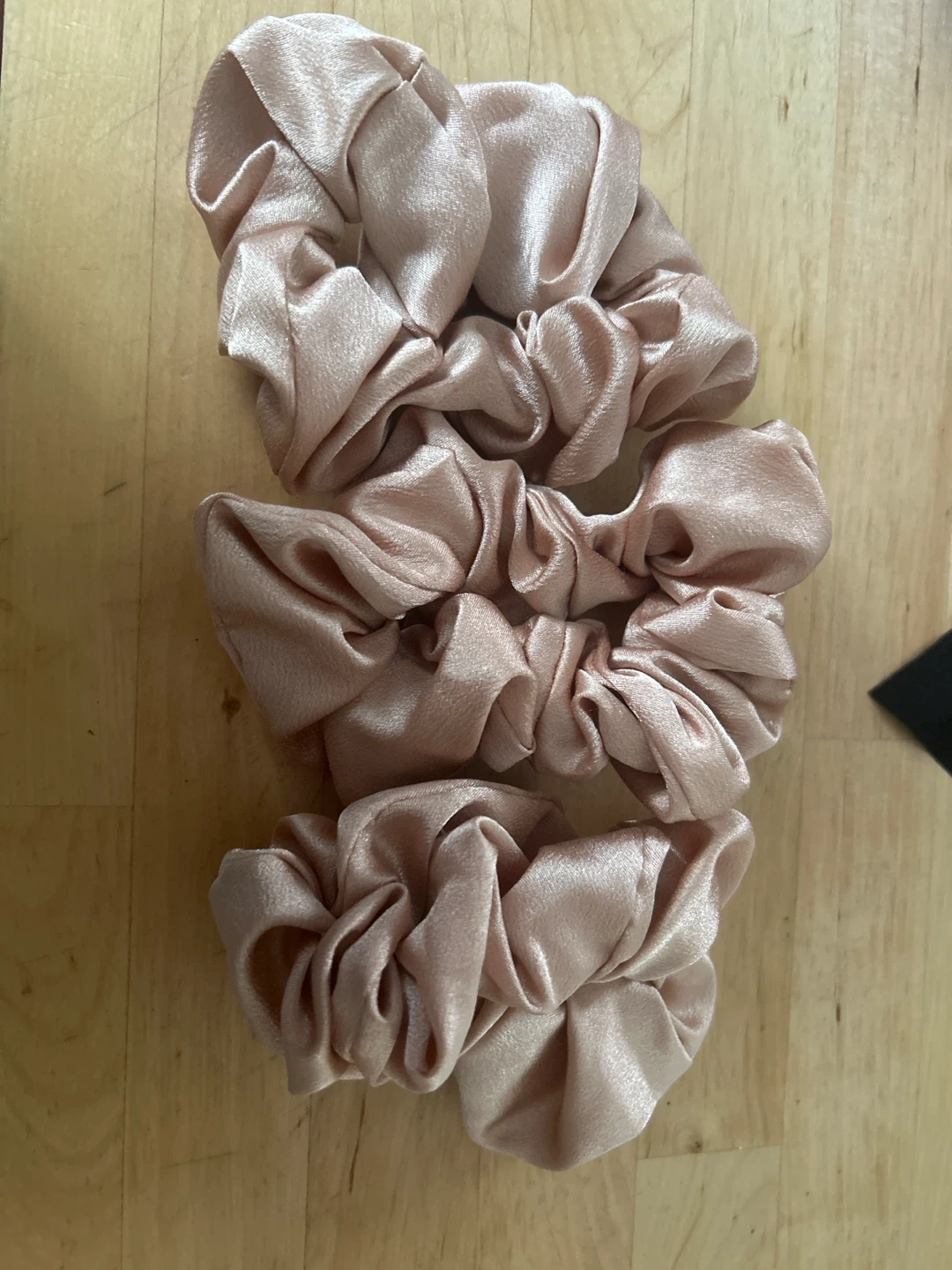 Selling a set of three lovely pink satin scrunchies! These are perfect for adding a touch of elegance to any hairstyle. The satin material is soft and gentle on your hair, helping to prevent breakage. They're in great condition and ready for a new home $3 each or $9 for the set