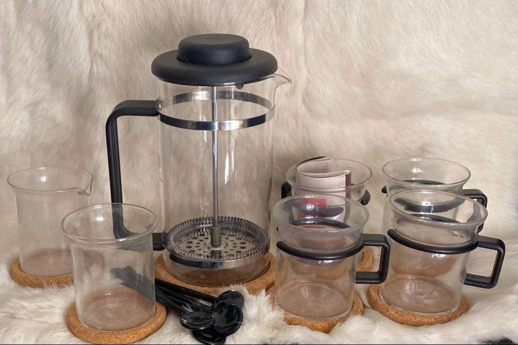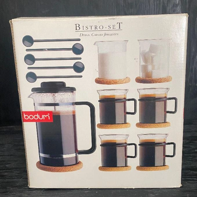 Bring joy into your coffee ritual with the Bodum Bistro Set by designer Carsten Jorgensen. Blending Danish minimalism with a functional French press, every cup feels special. Every morning feels intentional. It is a reflection of your style and your tastes that will please those that you offer a fresh cup of coffee to. The stunning Danish designed French Press set is both minimalist and effective and can be used every day or showcased for special events amongst family and friends. See the color and strength in the glass while it holds your favorite coffee blend. Bodum is renowned for creating products that emphasize both utility and a sleek, modern aesthetic, making the Bistro Set a favorite among coffee enthusiasts and collectors. It includes all pieces necessary for you to host a dinner party, a delicious brunch or a breakfast gathering with friends. This Bodum French Press Bistro Set in new and never used and comes with the original box.