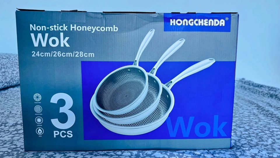 This is a new Non-stick Honeycomb Wok set from the brand HONGCHENDA. The wok features a modern and stylish honeycomb pattern design on its cooking surface. This design helps to minimize the amount of oil needed during cooking and provides excellent food release, making stirring and flipping easy. The non-stick coating is durable and ensures easy cleaning after use. This set includes 3 pieces and is available in multiple sizes to suit different needs: 24cm, 26cm, and 28cm. Ideal for everyday cooking, this wok is perfect for frying, sautéing, and stir-frying, offering great heat distribution and a long-lasting, user-friendly cooking experience.