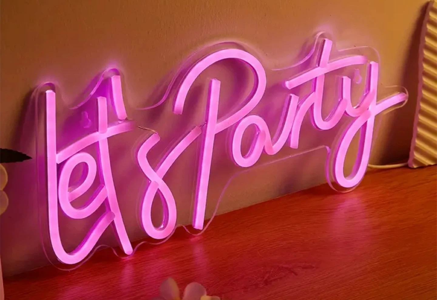 Get ready to light up your space with this fun "Let's Party" neon sign! It measures approximately 14 inches (36cm) in length and 6 inches (15.3cm) in height. Perfect for adding a pop of colour to any room or event