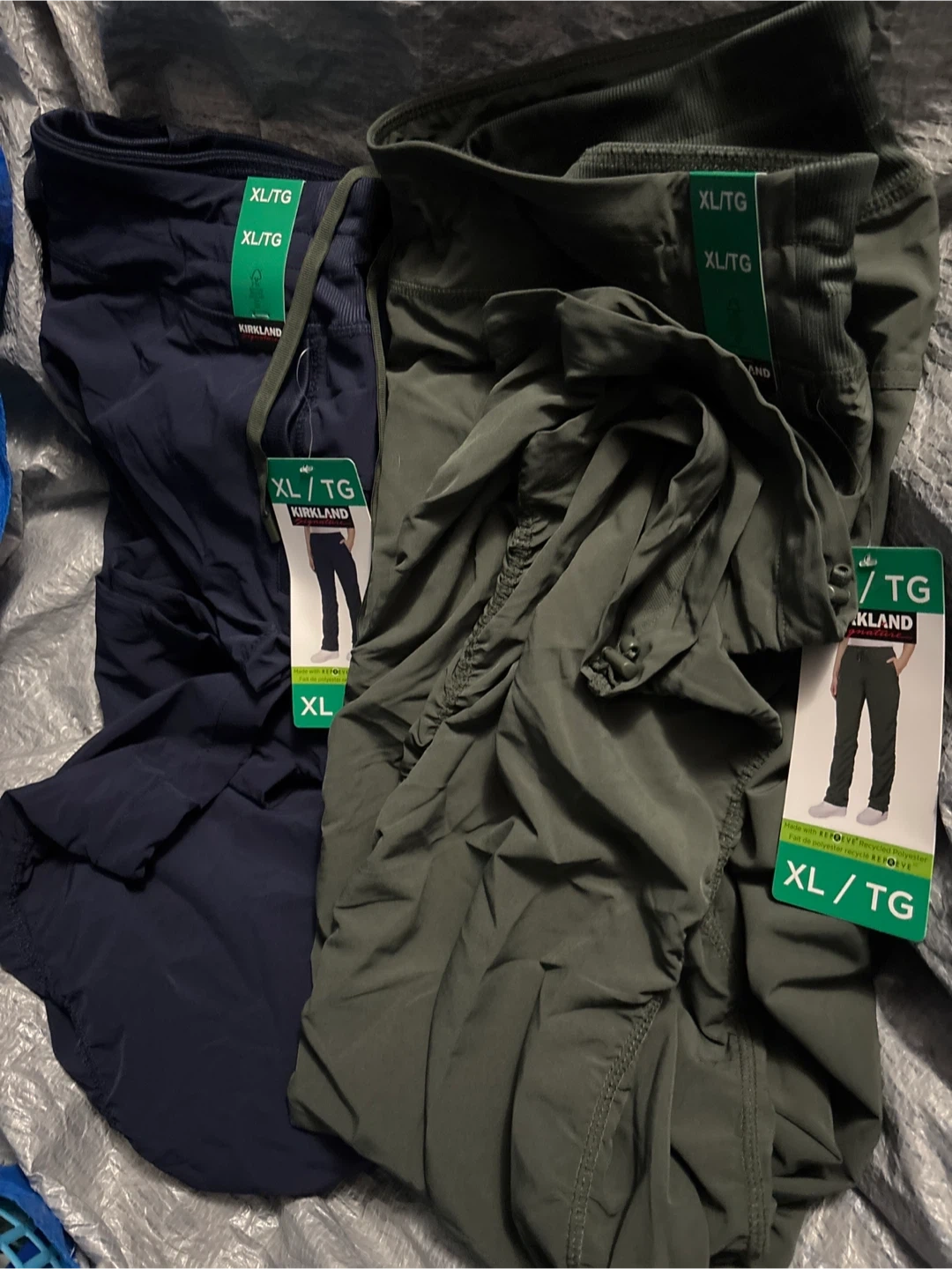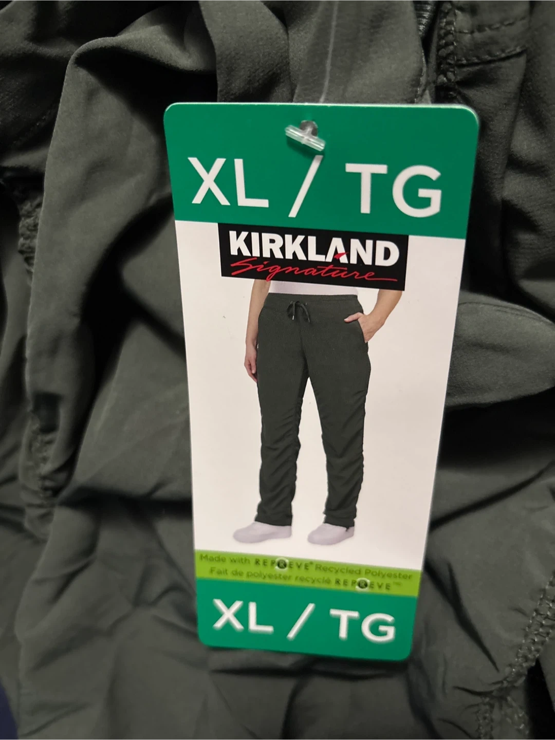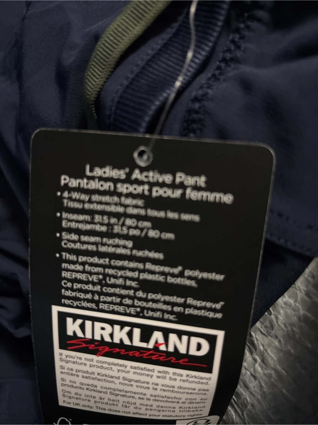 New with tags! Kirkland Signature Ladies' Active Pants in size XL. They feature a 4-way stretch fabric and are made with Repreve recycled polyester. The inseam is 31.5 inches/80 cm. Navy blue and green.