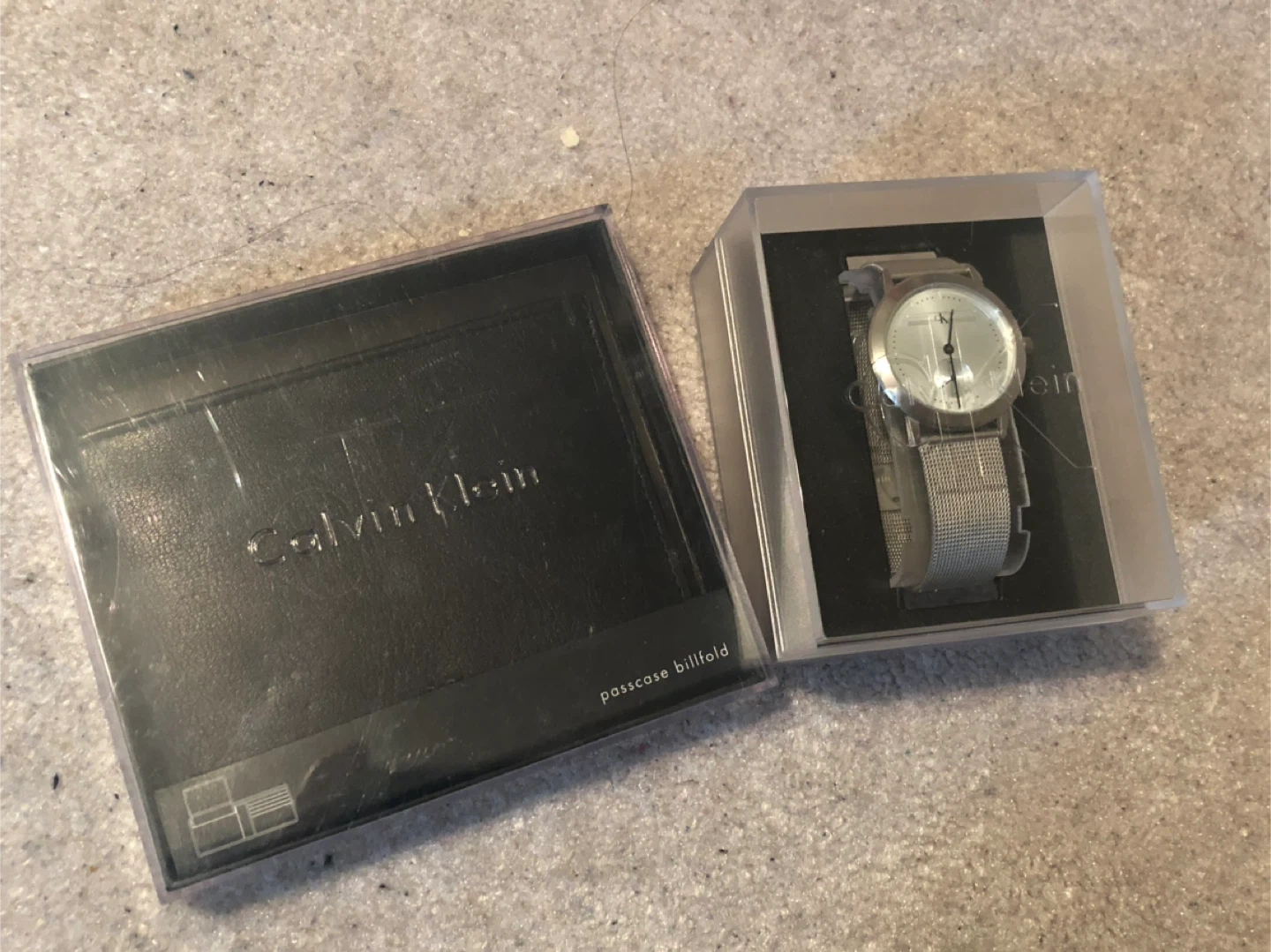 Selling a Calvin Klein watch and passcase billfold set. The watch comes in its original box. The wallet is a classic black leather style. Both items are in excellent condition and ready for a new home!