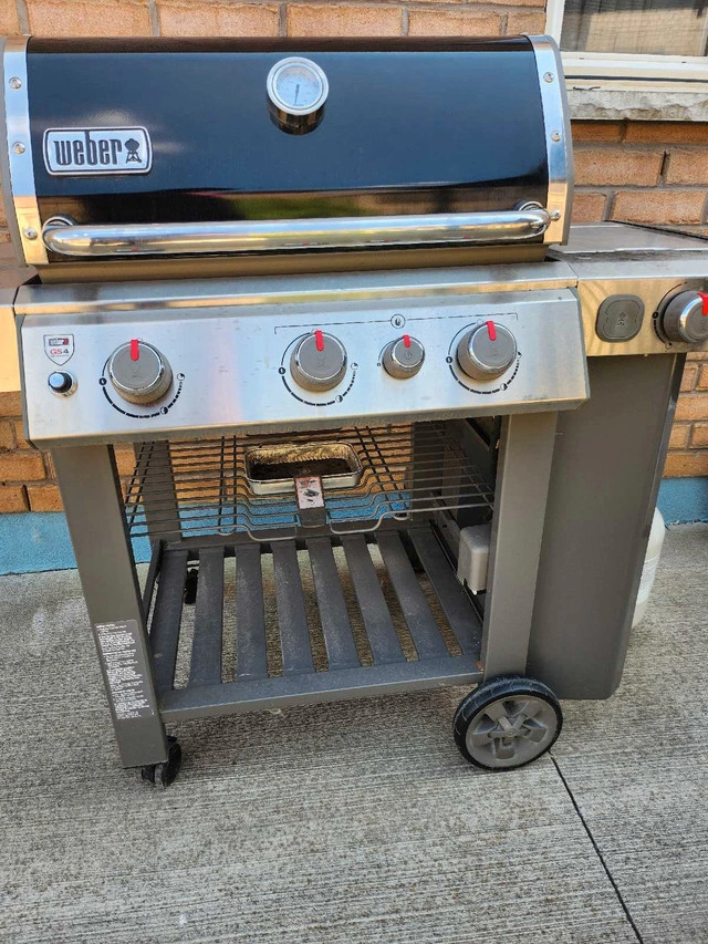 This is a used Weber Genesis II Special Edition GS4 gas grill, perfect for all your grilling needs! It has been well-maintained and is ready for a new home. It features a powerful GS4 grilling system, ensuring even heat distribution and consistent results every time. This grill has served me well, and it's still got plenty of life left in it. Key features include: * Three stainless steel burners * Porcelain-enameled cast iron cooking grates * Electronic ignition system * Built-in thermometer * Warming rack * Cover for barbecue * Propane cylinder