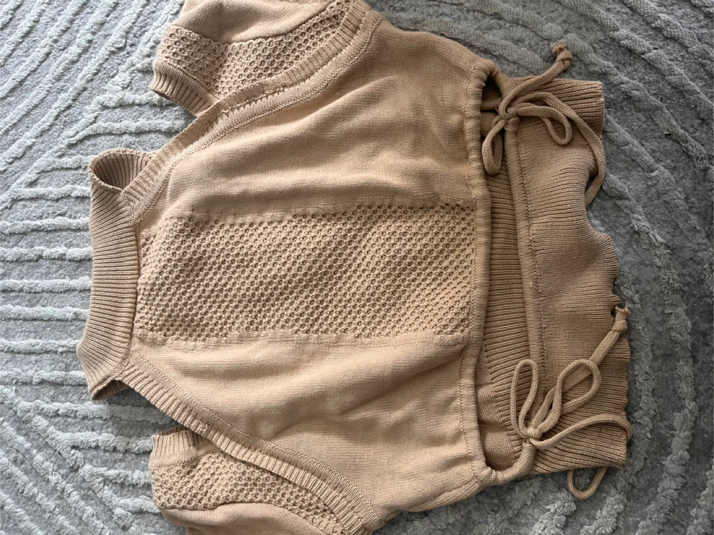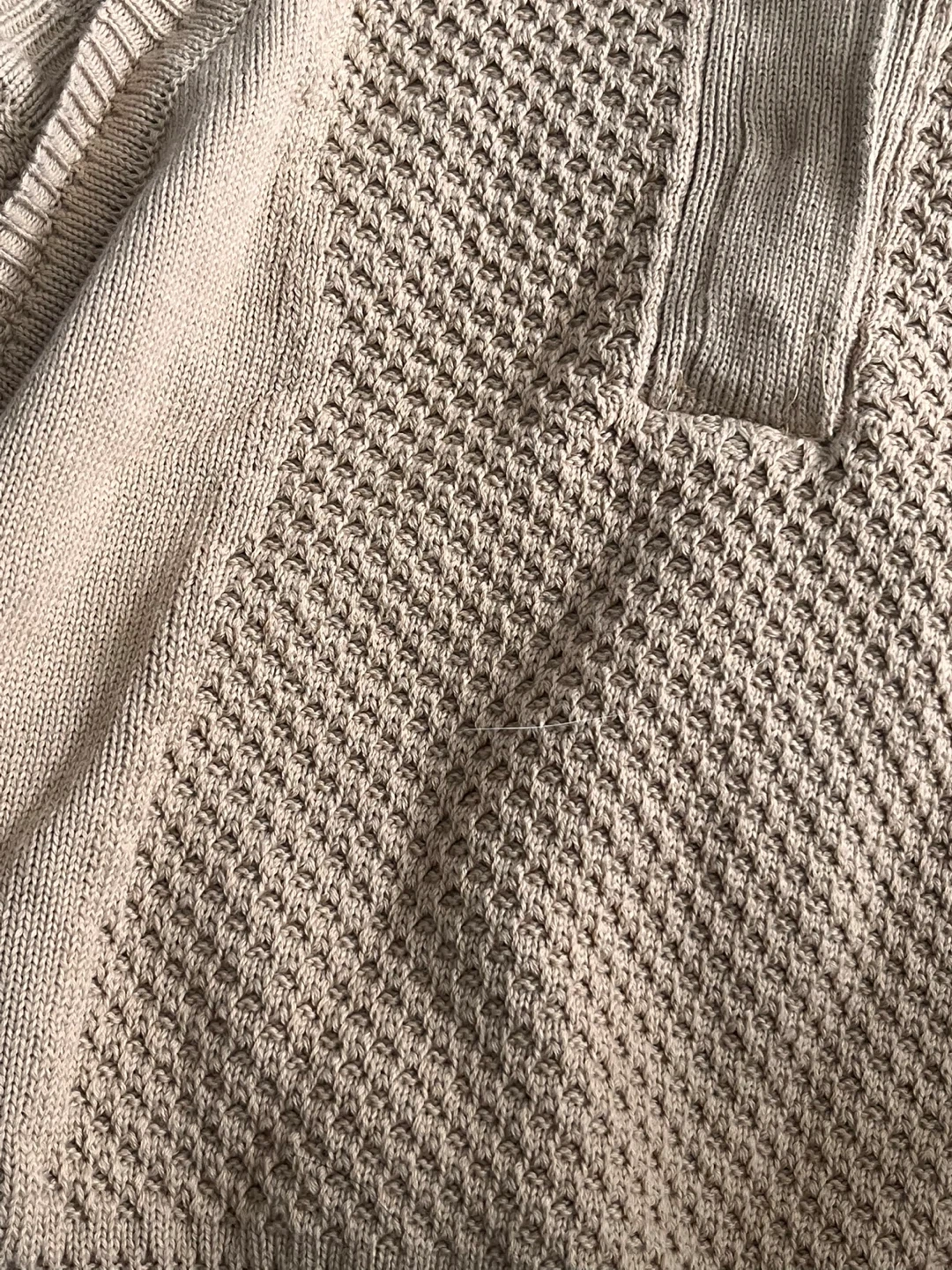Here's a cozy beige knit cardigan! It's in great condition and would be perfect for layering. The material is soft and comfortable, and the design is quite stylish. It's a versatile piece that can be dressed up or down, making it a great addition to any wardrobe