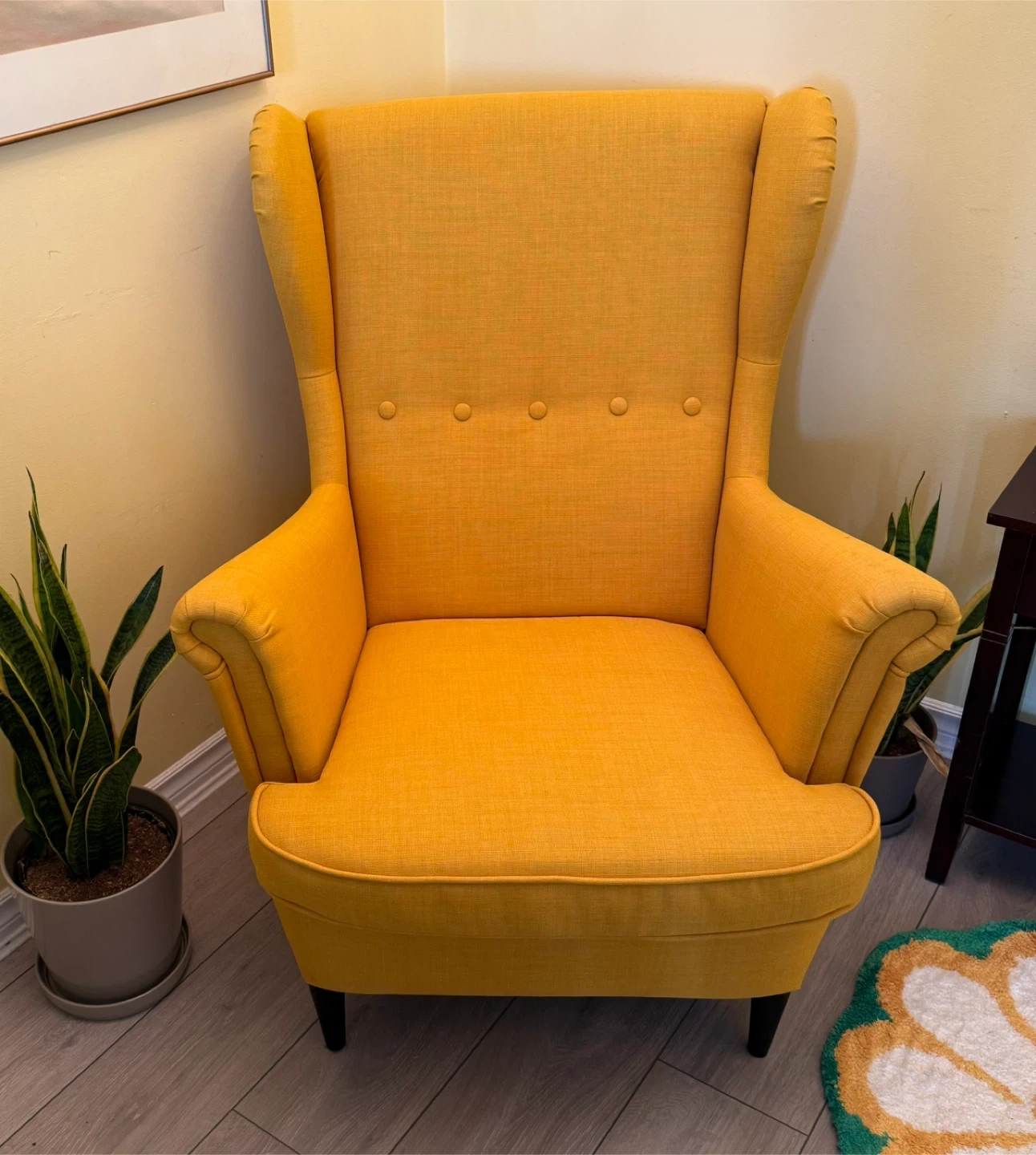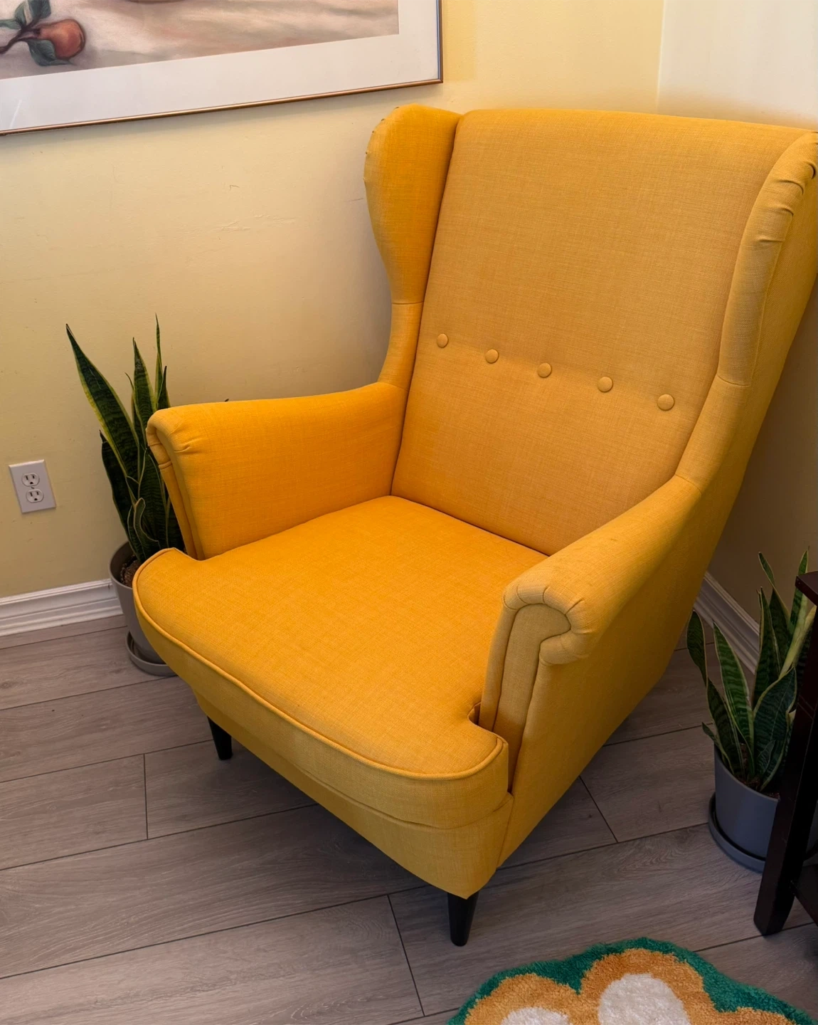 Selling a lovely yellow IKEA Strandmon wing chair! It's in great condition and would brighten up any room. The chair features a high back for extra support and comfort. It's made of a durable fabric and has a classic design that fits well with various decor styles. New Condition ( retailing at $350/-)