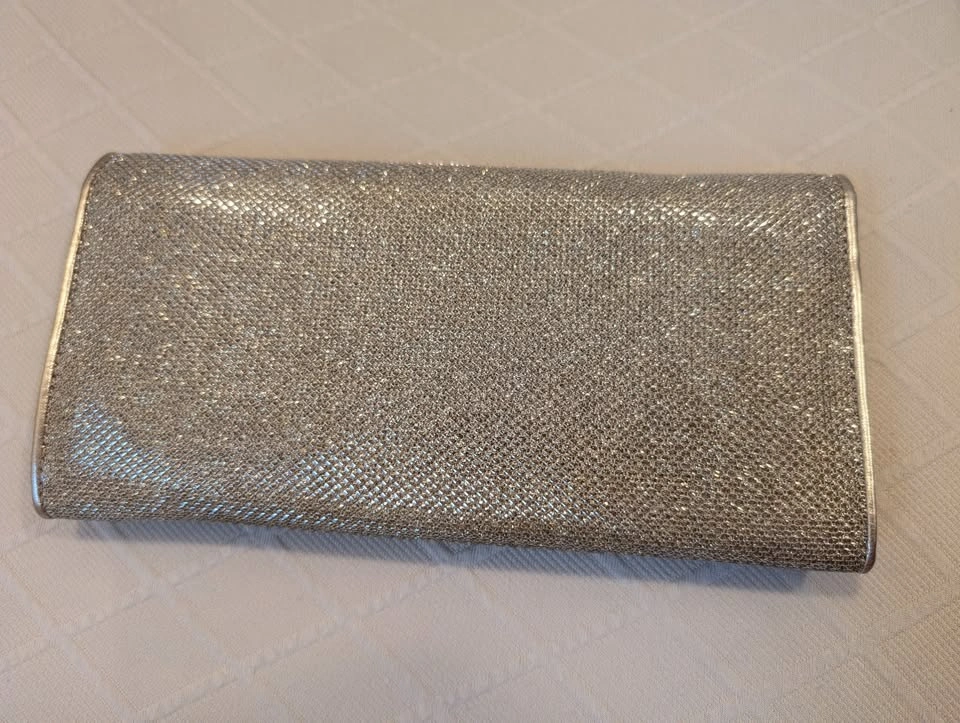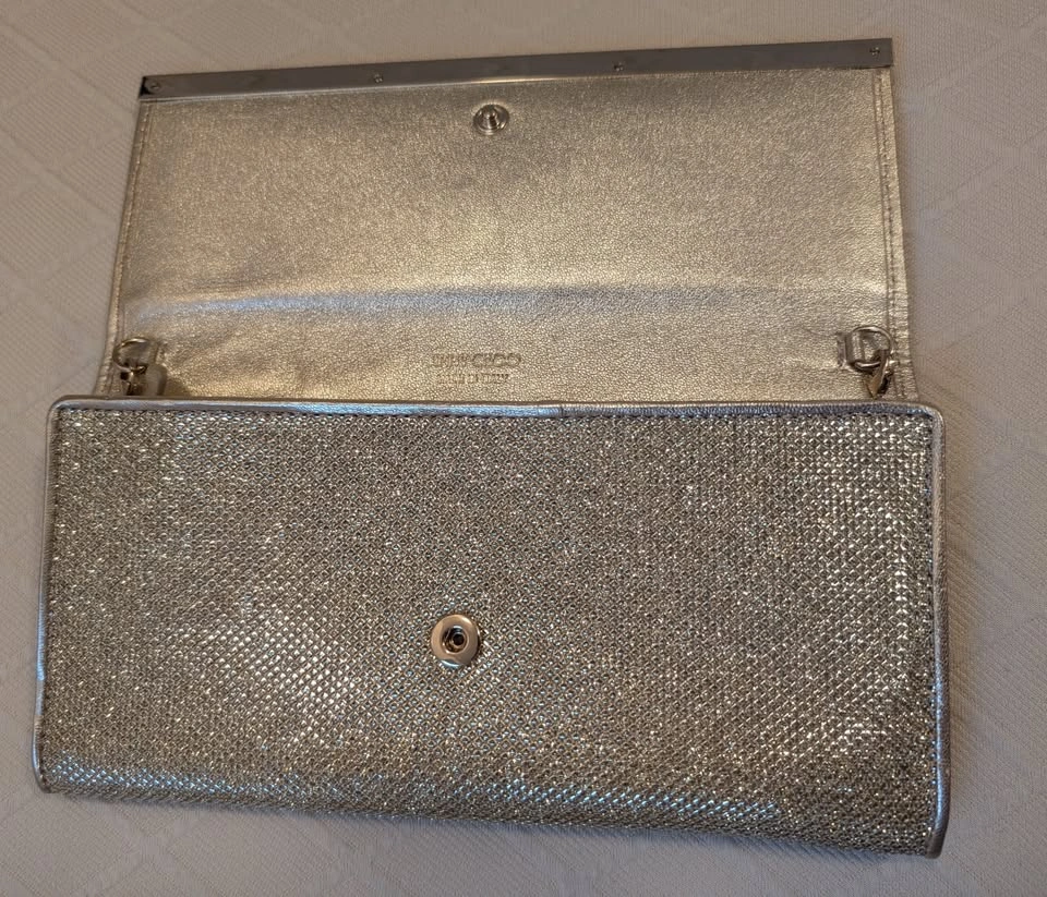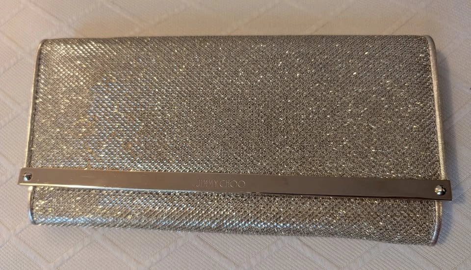 Authentic Jimmy Choo - Glitter Gold Leather Clutch Bag - Women's A classic, luxurious designer bag for formal events, weddings, and red carpet events Size: 22 cm x 11 cm Like new - Excellent, Pristine condition Original price: $1,200 + Tax Special occasion bag with: ~ Certificate of Authenticity ~ Fabric cover ~ Box ~ Gift bag Purchased from the Jimmy Choo store in Yorkdale, Toronto