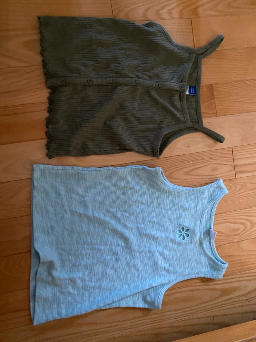 Two cute tank tops for girls! One is a light blue with a small flower design, and the other is an olive green button-up style with lettuce trim. Light blue tank is size XL (14-16) and olive green tank is L (10-12). From Old Navy and in great condition for your little one ☺️