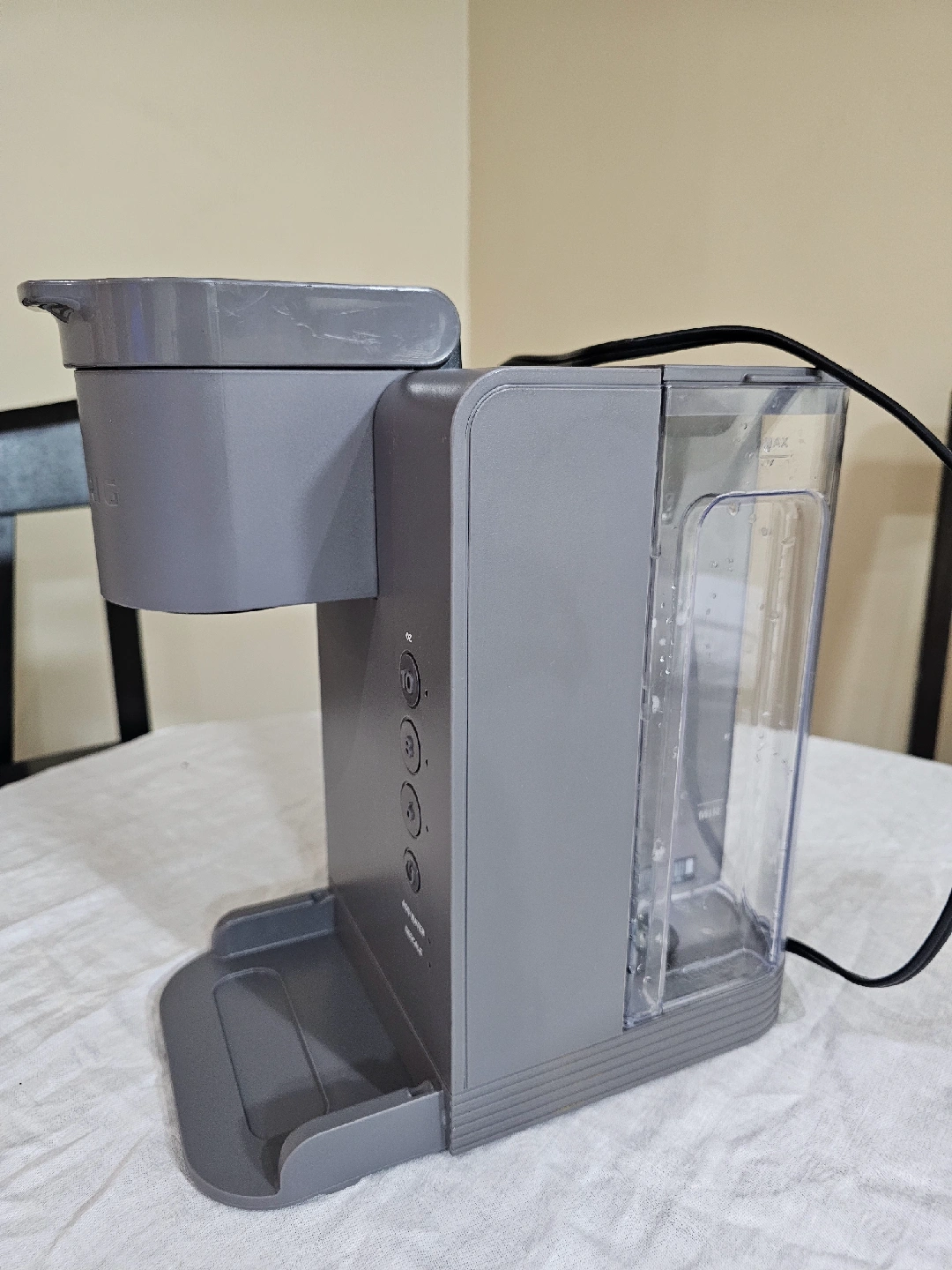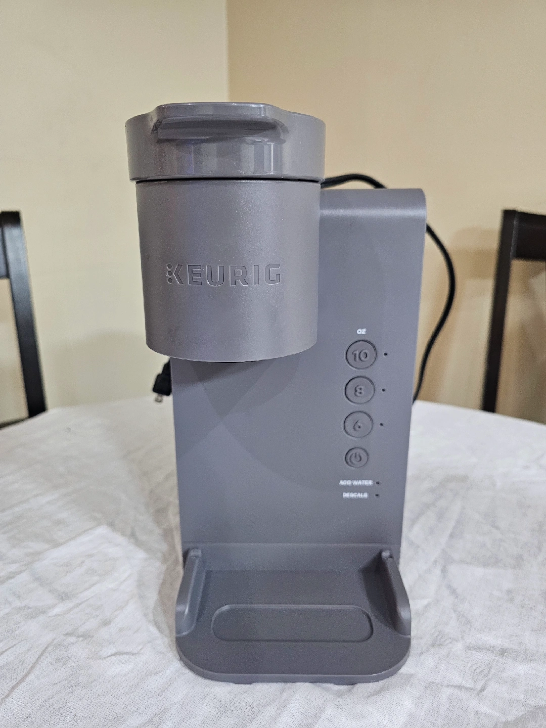Selling a Keurig single serve coffee maker in grey. It has buttons for 6, 8, and 10 oz sizes. There are also options to add water and descale