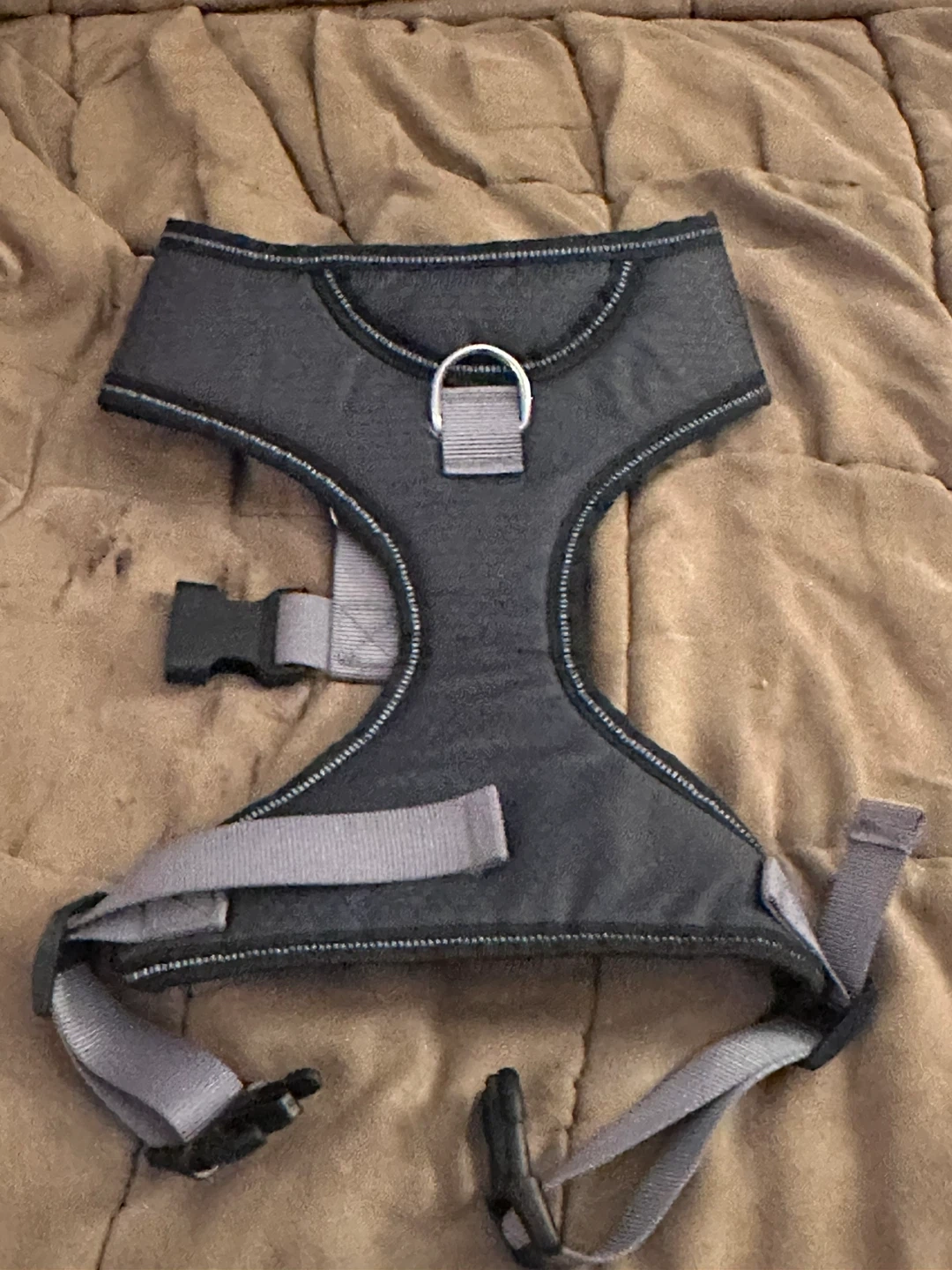 Selling a dog harness in size large. It's in great condition and ready for your furry friend's adventures! The harness is grey and black with adjustable straps for a comfortable and secure fit