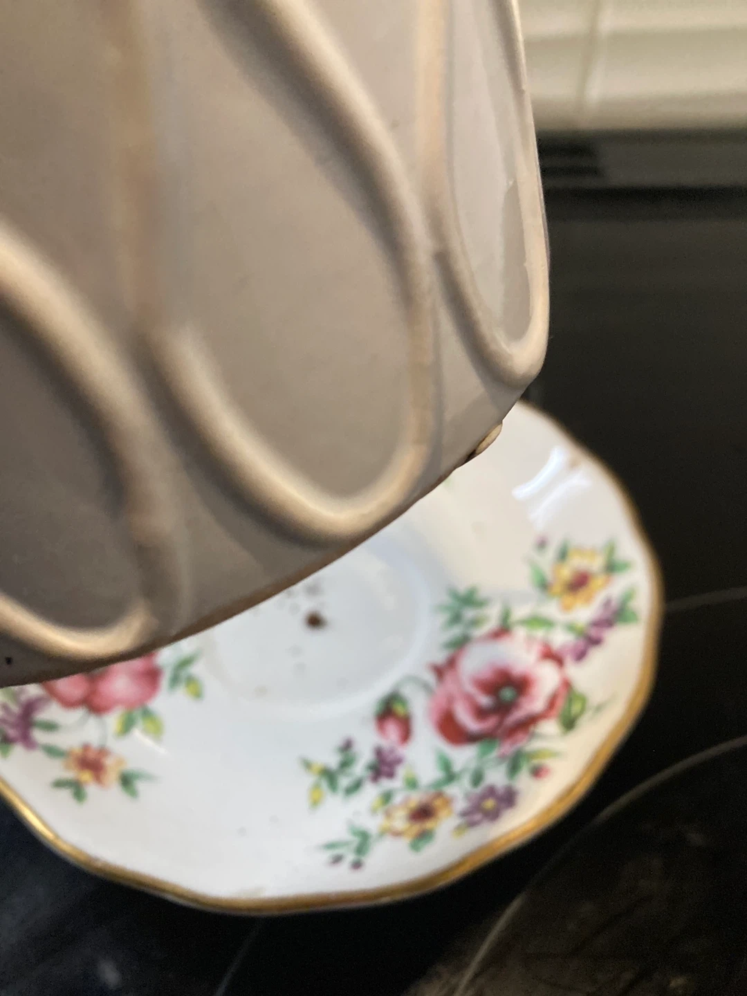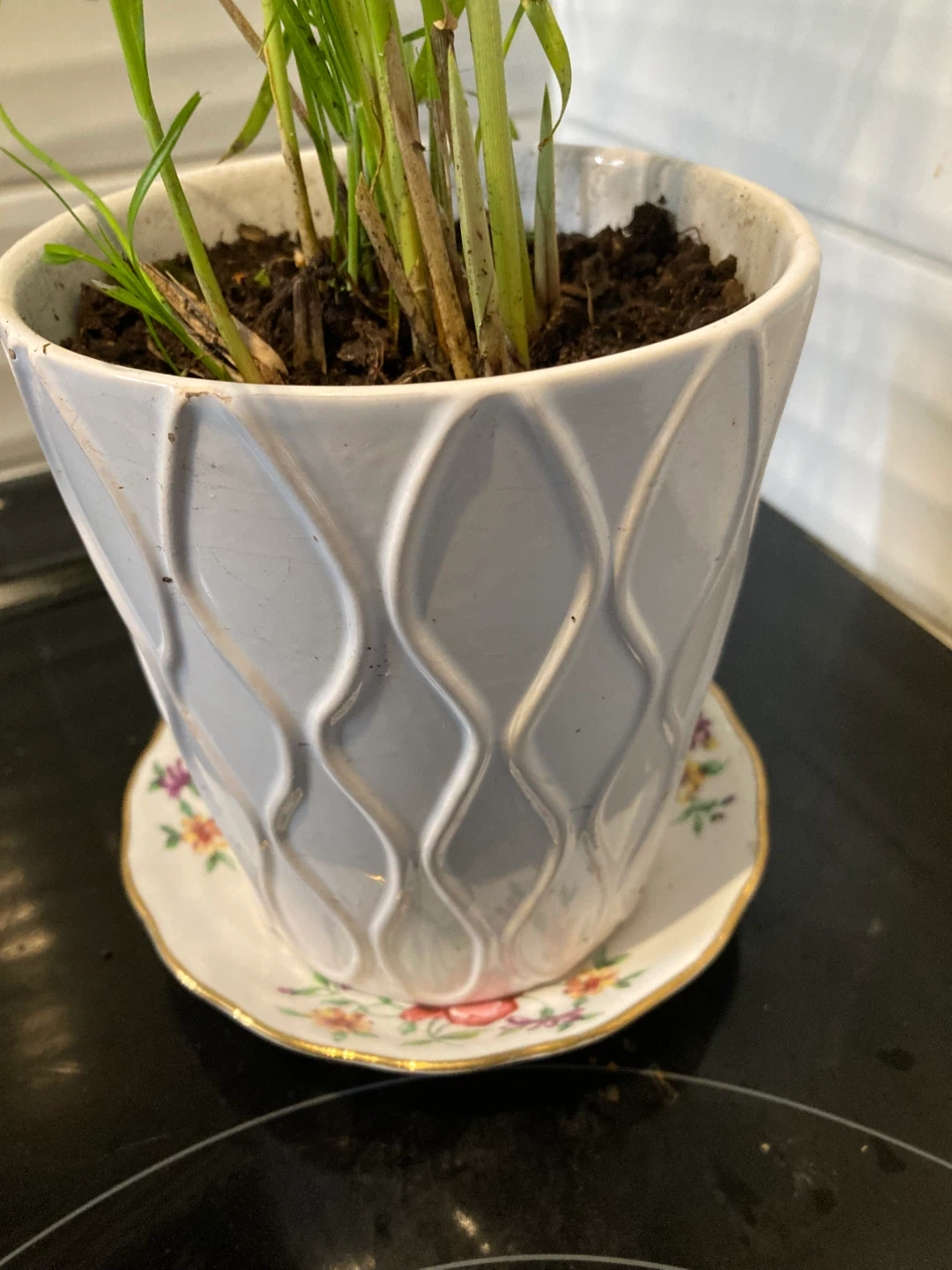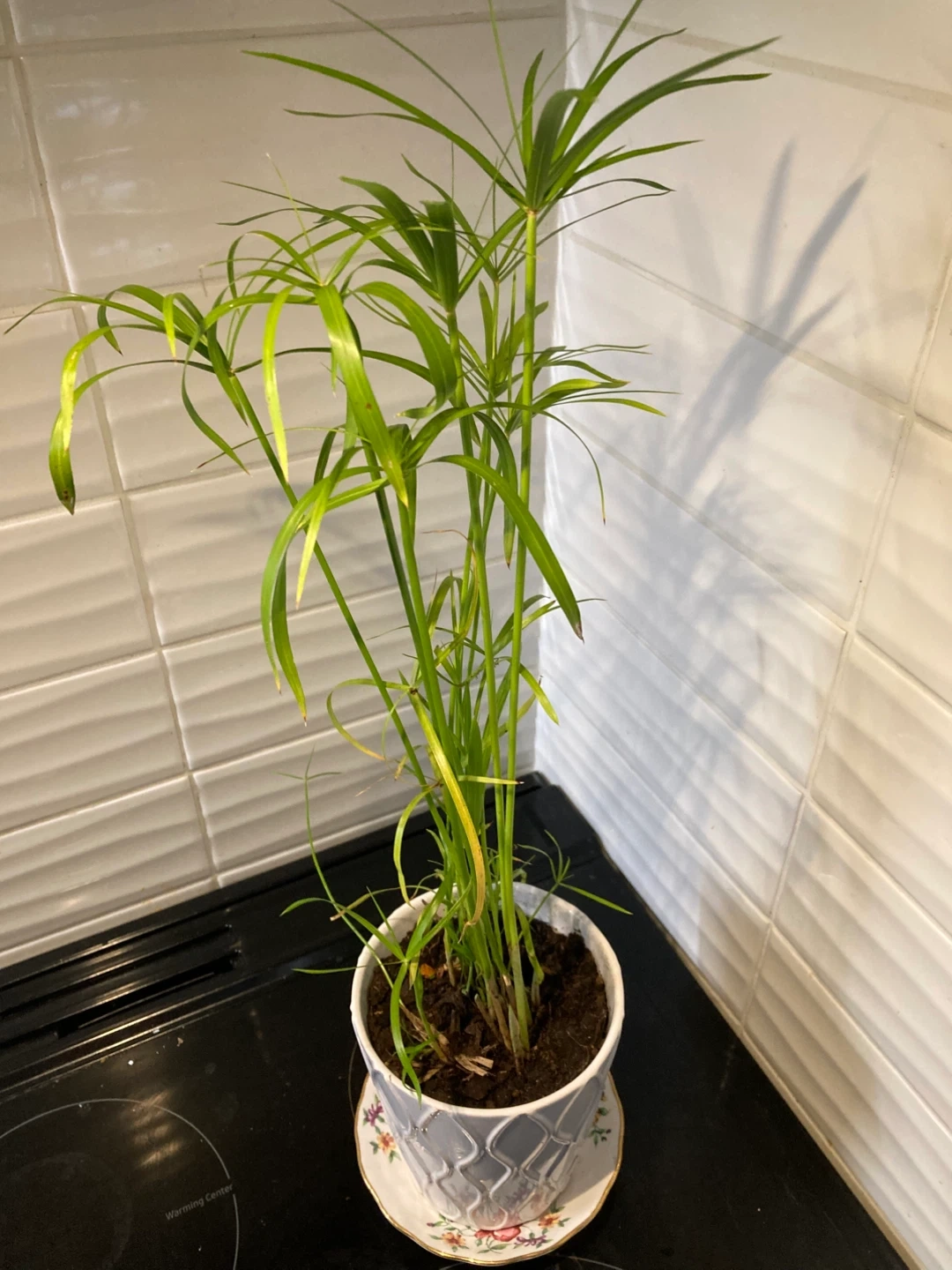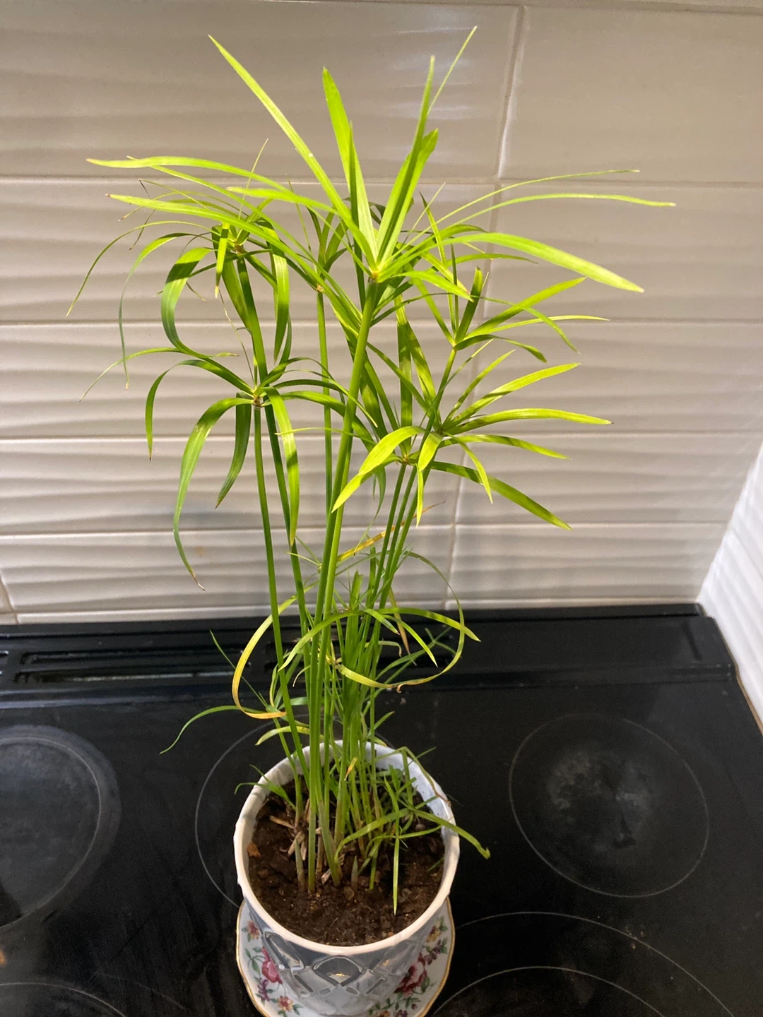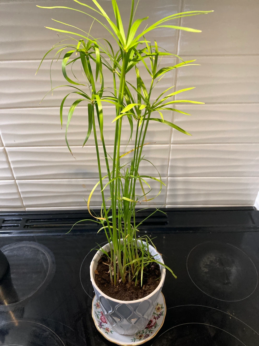 Selling a healthy papyrus plant in a white pot with bone chins tea saucer. It's a beautiful plant that adds a touch of greenery to any space. The plant is well-cared for and ready to brighten up your home or office. These will eventually grow 2 feet tall, and then need repotting to a larger pot. They like wet feet—keep it well watered. Please check out all my plant posts!🌿