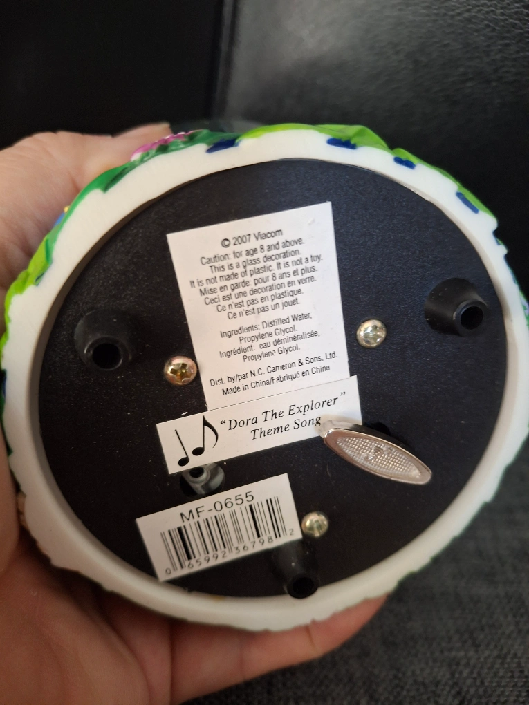 A cute Dora the Explorer snow globe! The base is decorated with Dora's friends and jungle foliage, and it plays the Dora the Explorer theme song.