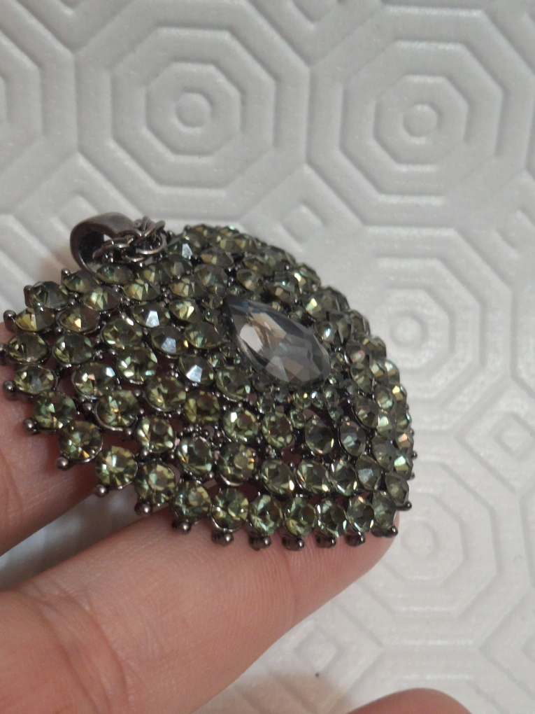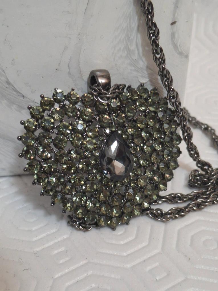 This is a cute rhinestone heart pendant necklace! It has a dark grey/silver green colour and is in great condition. Perfect for adding a bit of sparkle to your outfit!