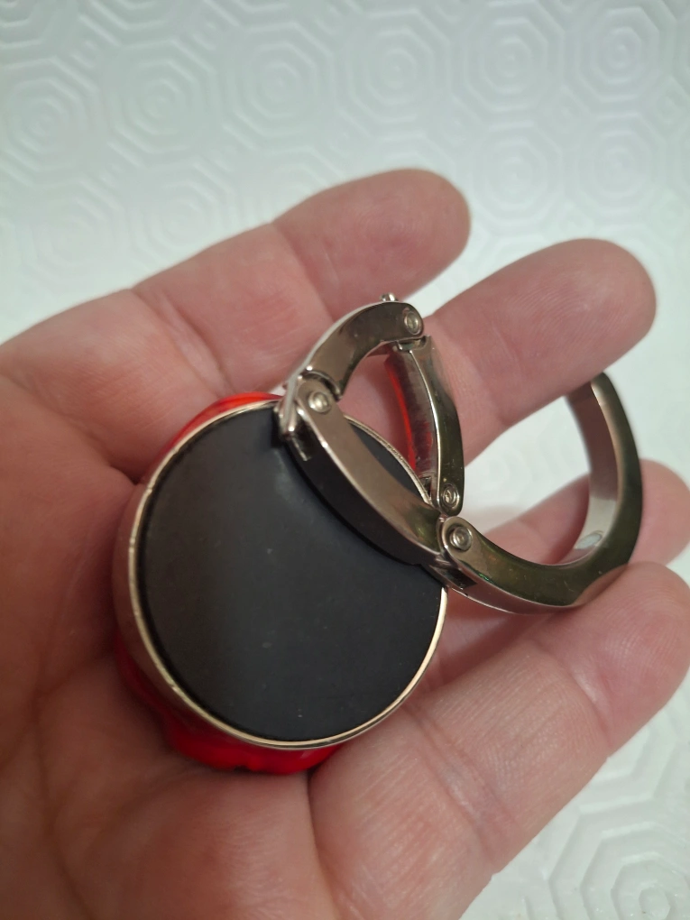 This is a lovely purse hook with a red rose design. It's perfect for keeping your purse off the floor when you're out and about