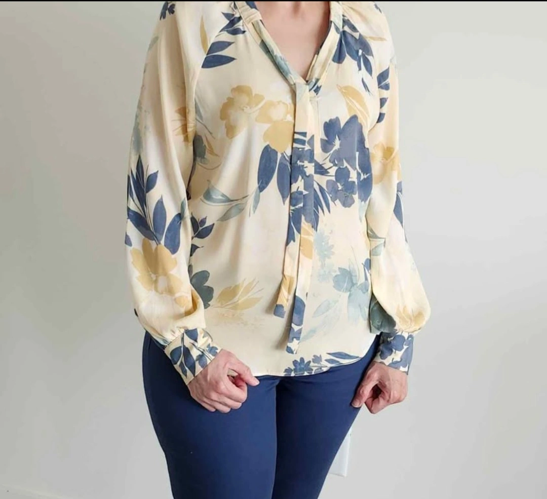 This is a lovely floral print blouse. It has a tie neck detail and long sleeves. Perfect for adding a touch of elegance to your wardrobe