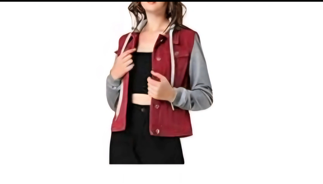 Here's a cute varsity jacket with a burgundy body and grey sleeves! It's perfect for layering and adding a pop of colour to your outfit
