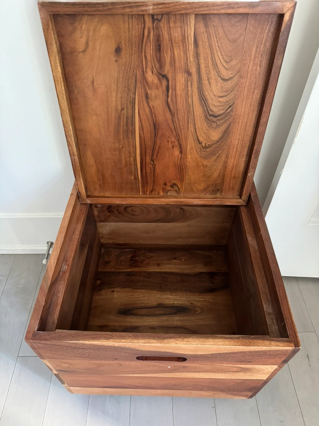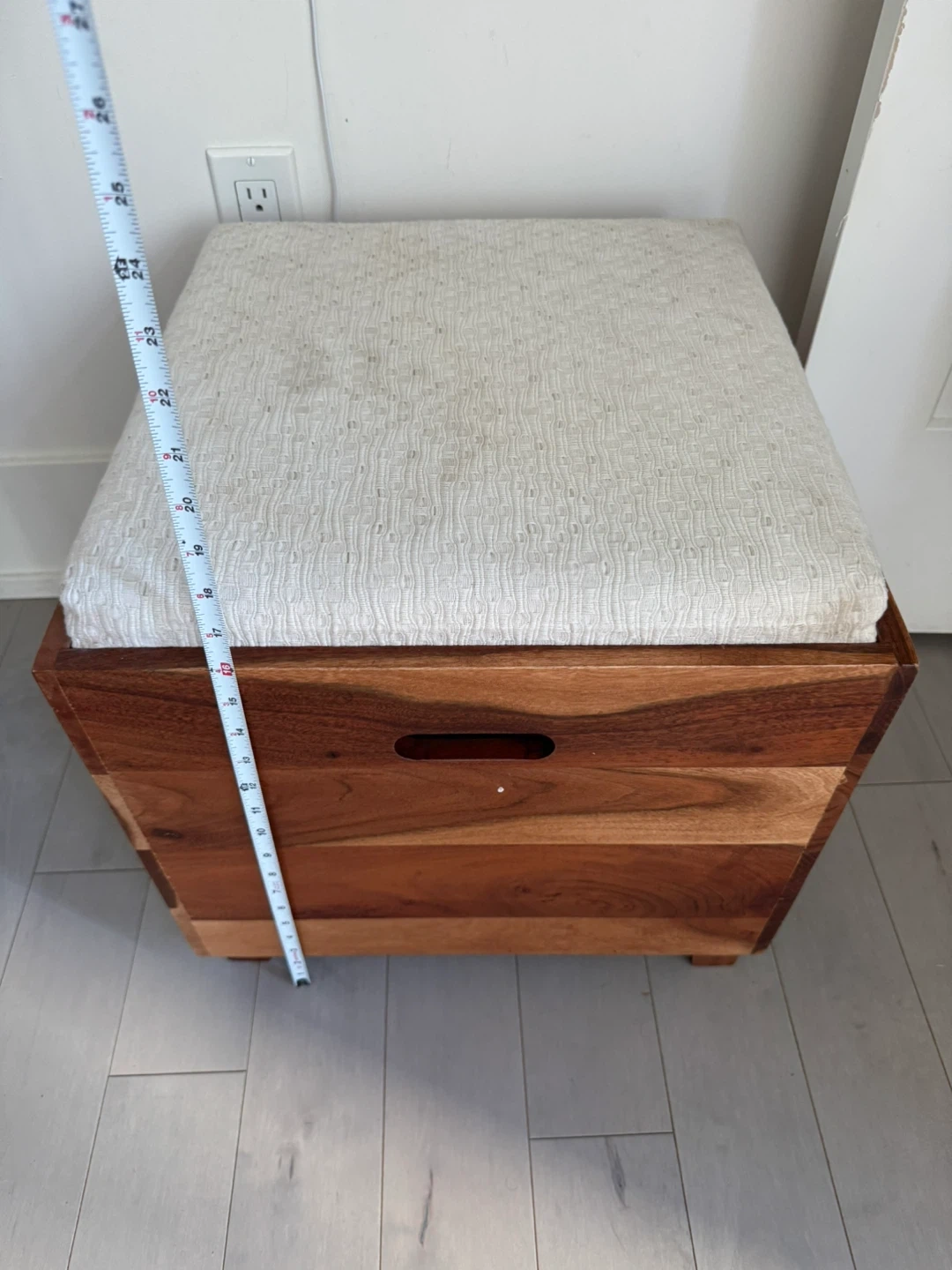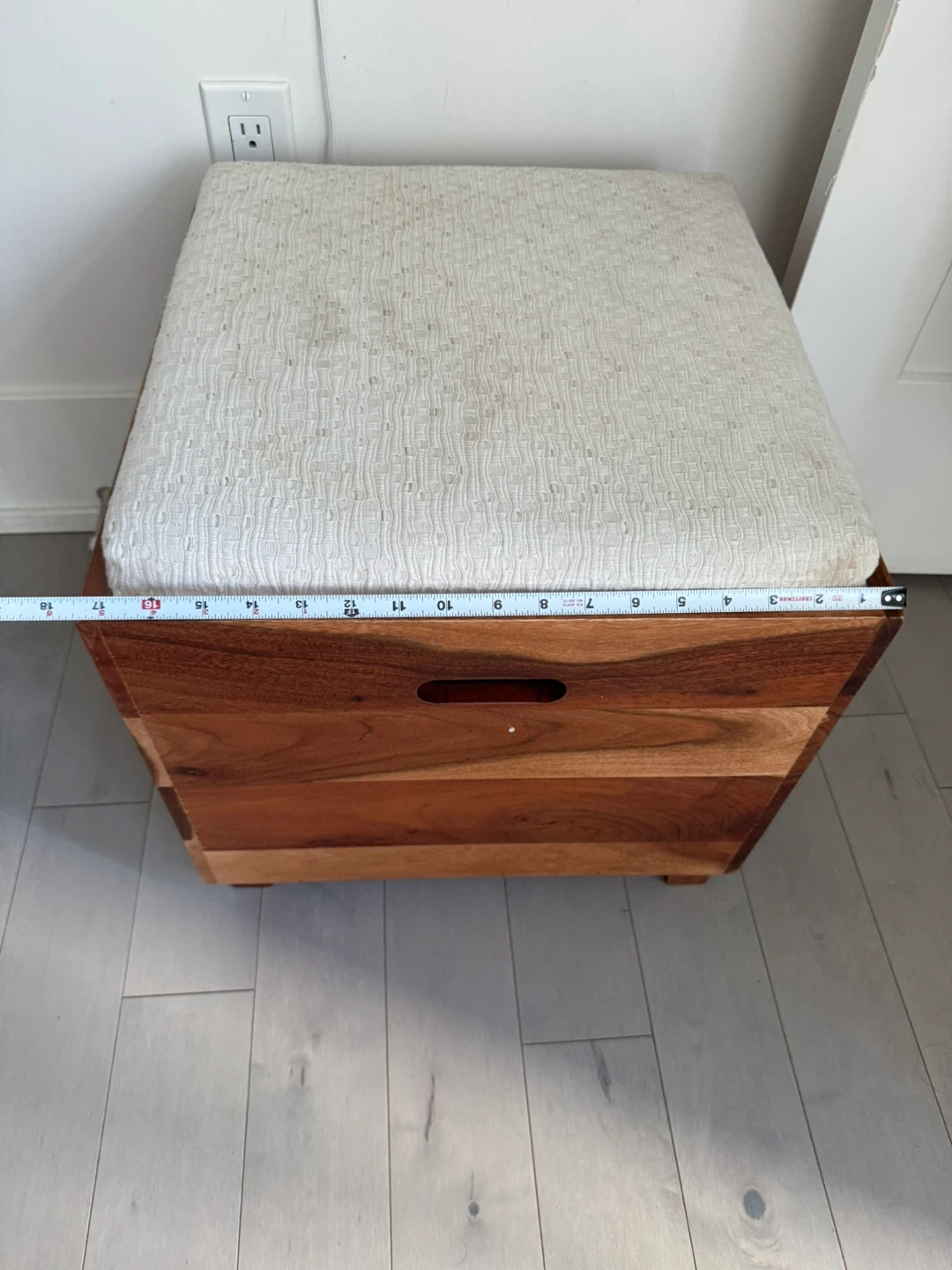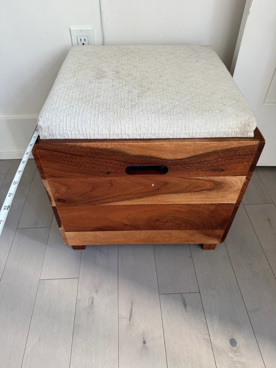 Here's a lovely wood storage ottoman! It features a cream-coloured cushion on top and a beautiful wood grain pattern. It's perfect for adding extra seating and storage to any room in your home. The ottoman measures approximately 18 inches in height and 17 inches in width.
