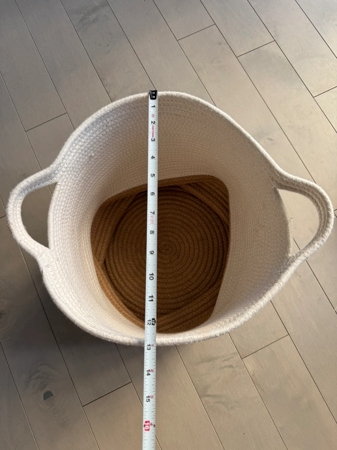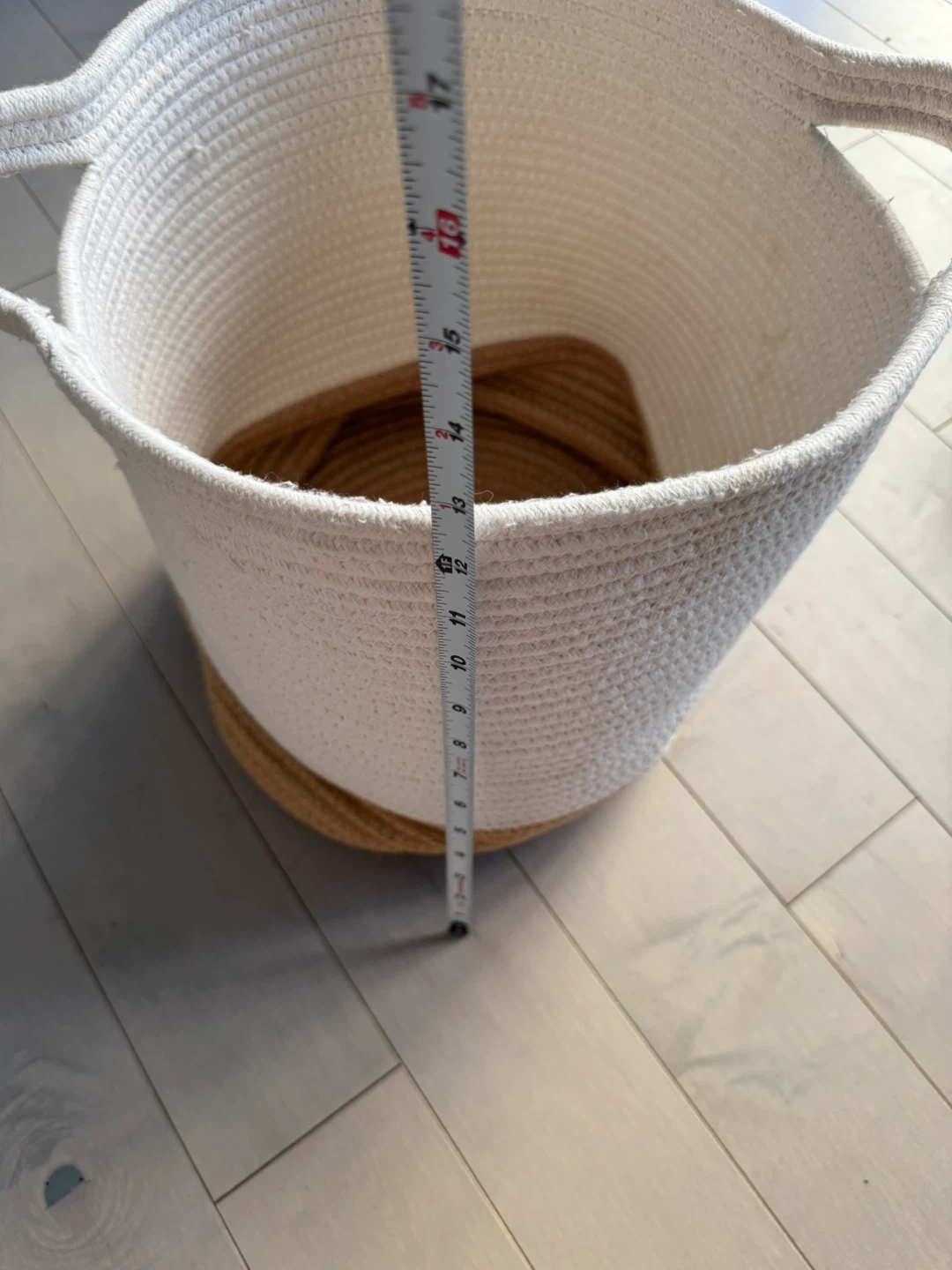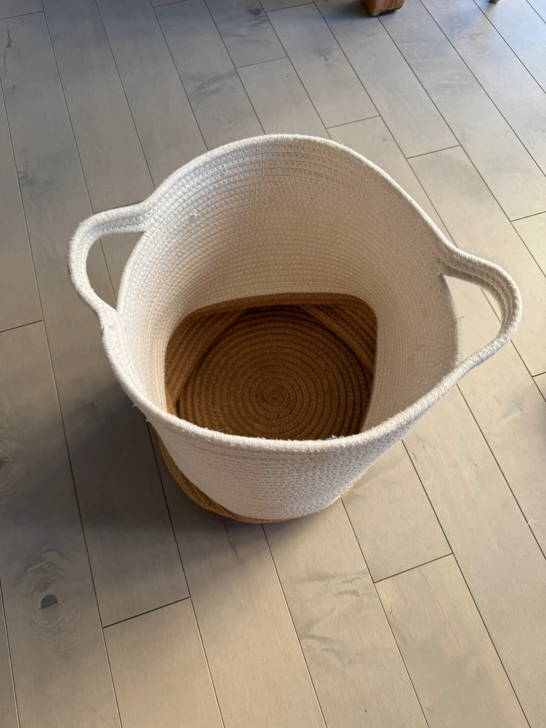 Here's a lovely woven storage basket! It features a white exterior and a brown interior base. It measures approximately 17 inches in height. Perfect for organizing toys, blankets, or laundry