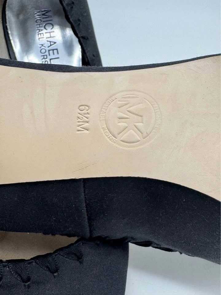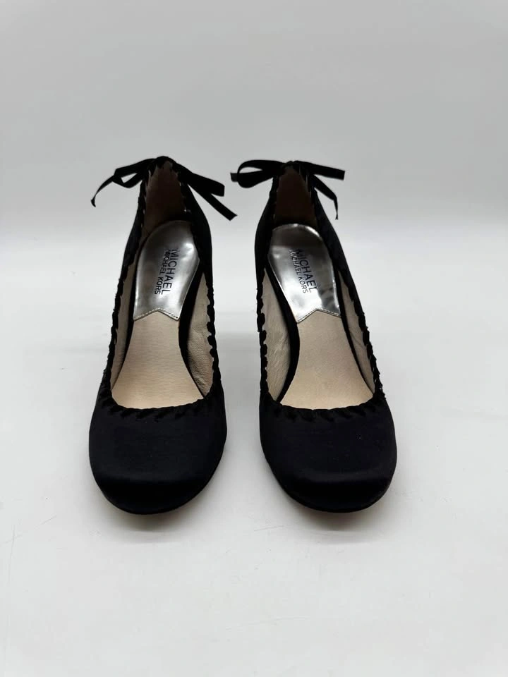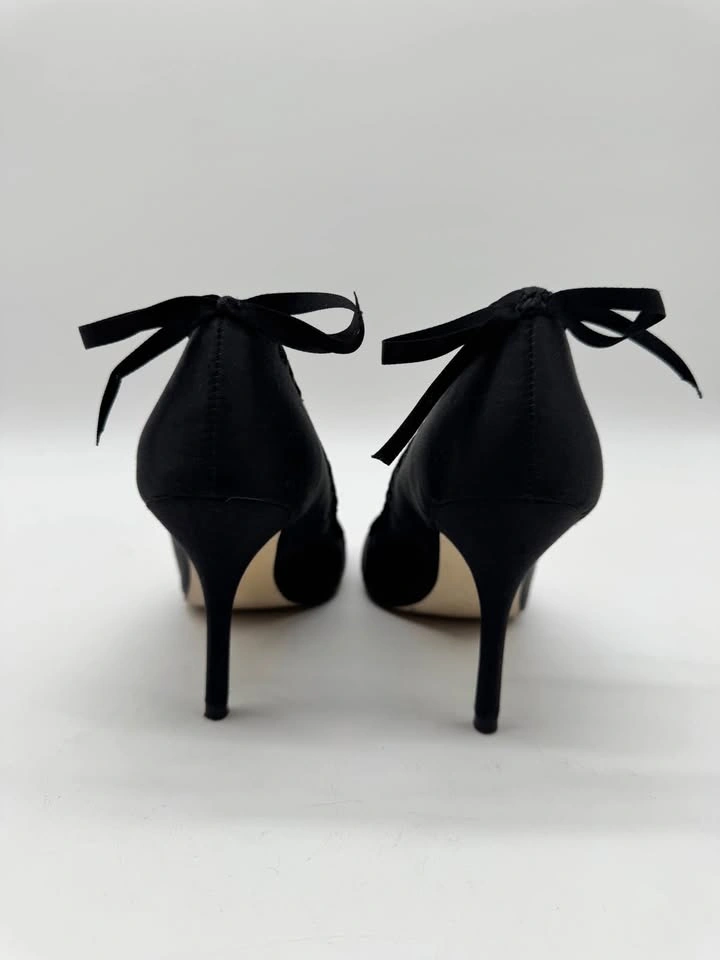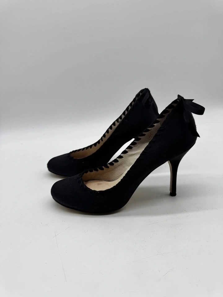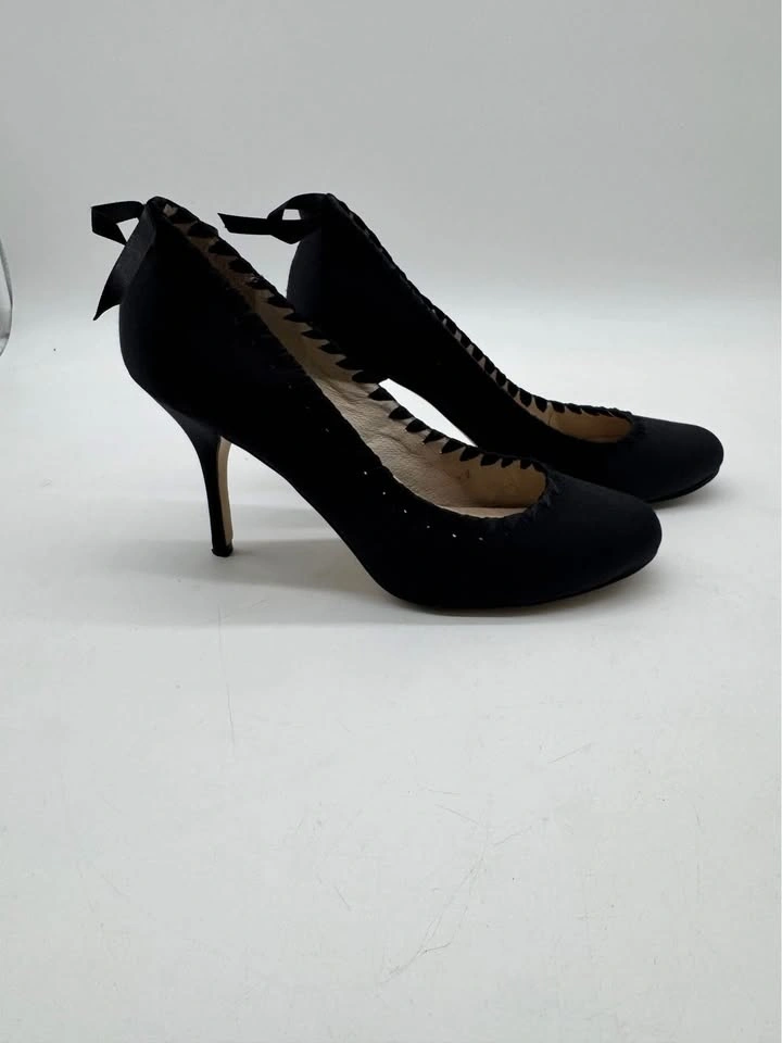 Elegant and timeless luxury heels crafted in smooth black satin. These heels feature a scalloped edge trim and a chic bow accent at the back, offering a graceful silhouette perfect for formal events, parties, or nights out. Size: Women’s 6.5 (US) Color: Classic Black Material: Satin fabric with leather sole Comfortable mid-heel height for stylish wear Excellent pre-owned condition
