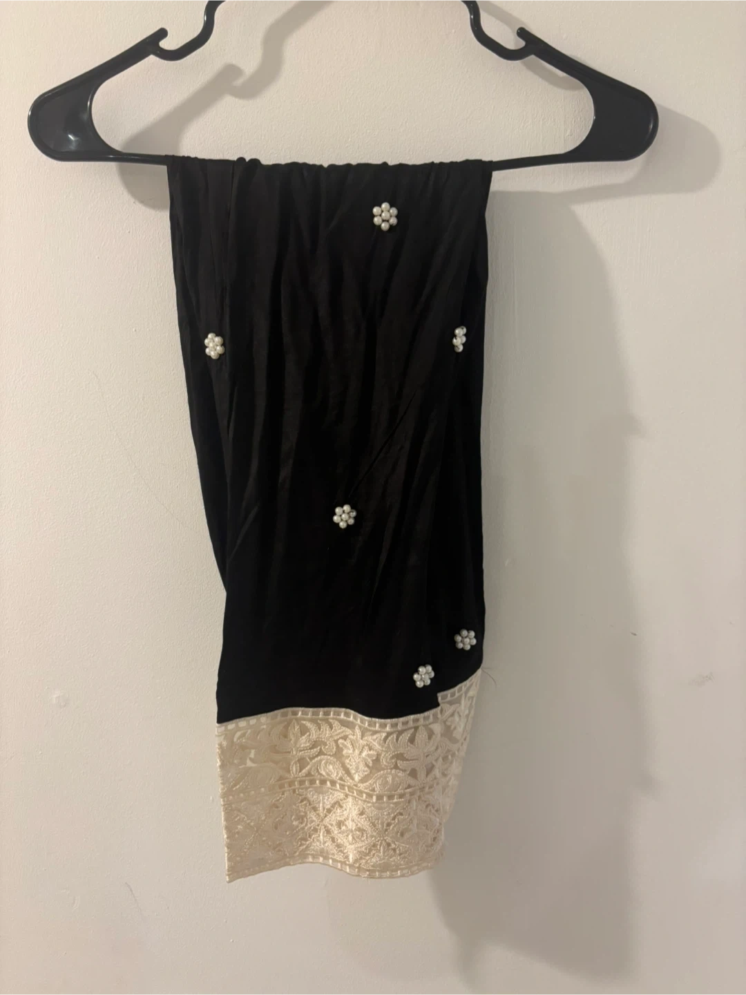 Selling a pair of black pants featuring delicate pearl detailing. The bottom hem has a beautiful lace trim. These pants are in great condition and would be a lovely addition to any wardrobe!