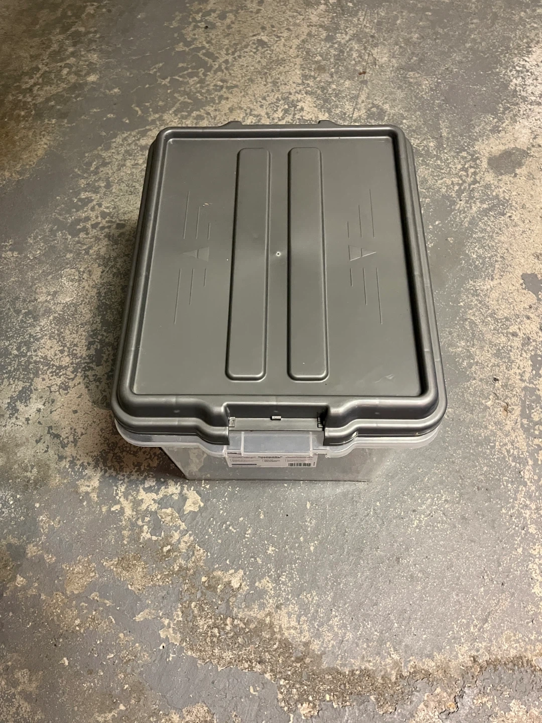 Selling a stackable storage container from Storage Solutions. It measures 18 x 14 x 13 inches (46cm x 36cm x 33cm). Perfect for keeping your items organized and easily accessible! Missing one handle