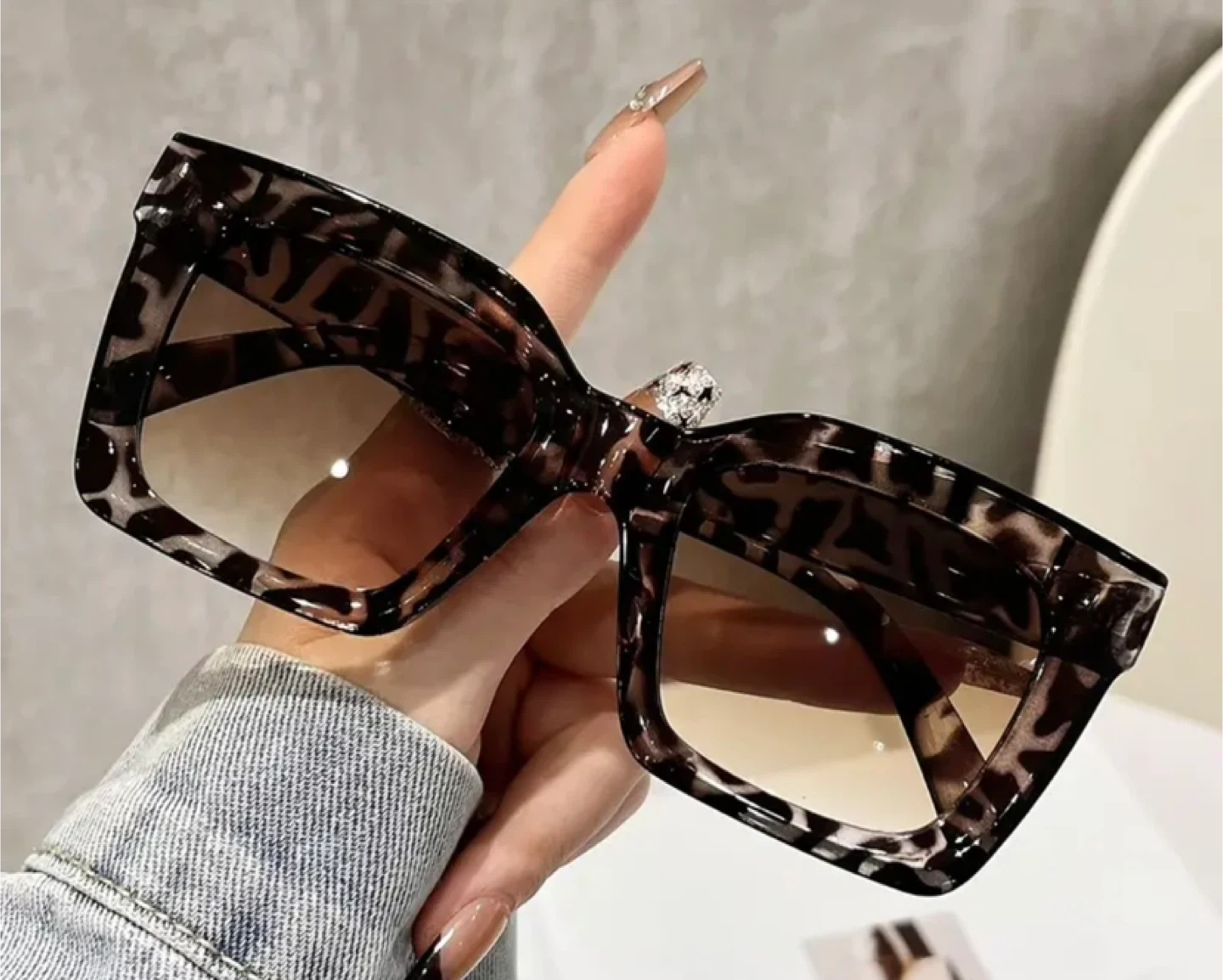 These are a pair of stylish sunglasses with a trendy leopard print frame! They have a square shape and gradient lenses, perfect for adding a fashionable touch to any outfit