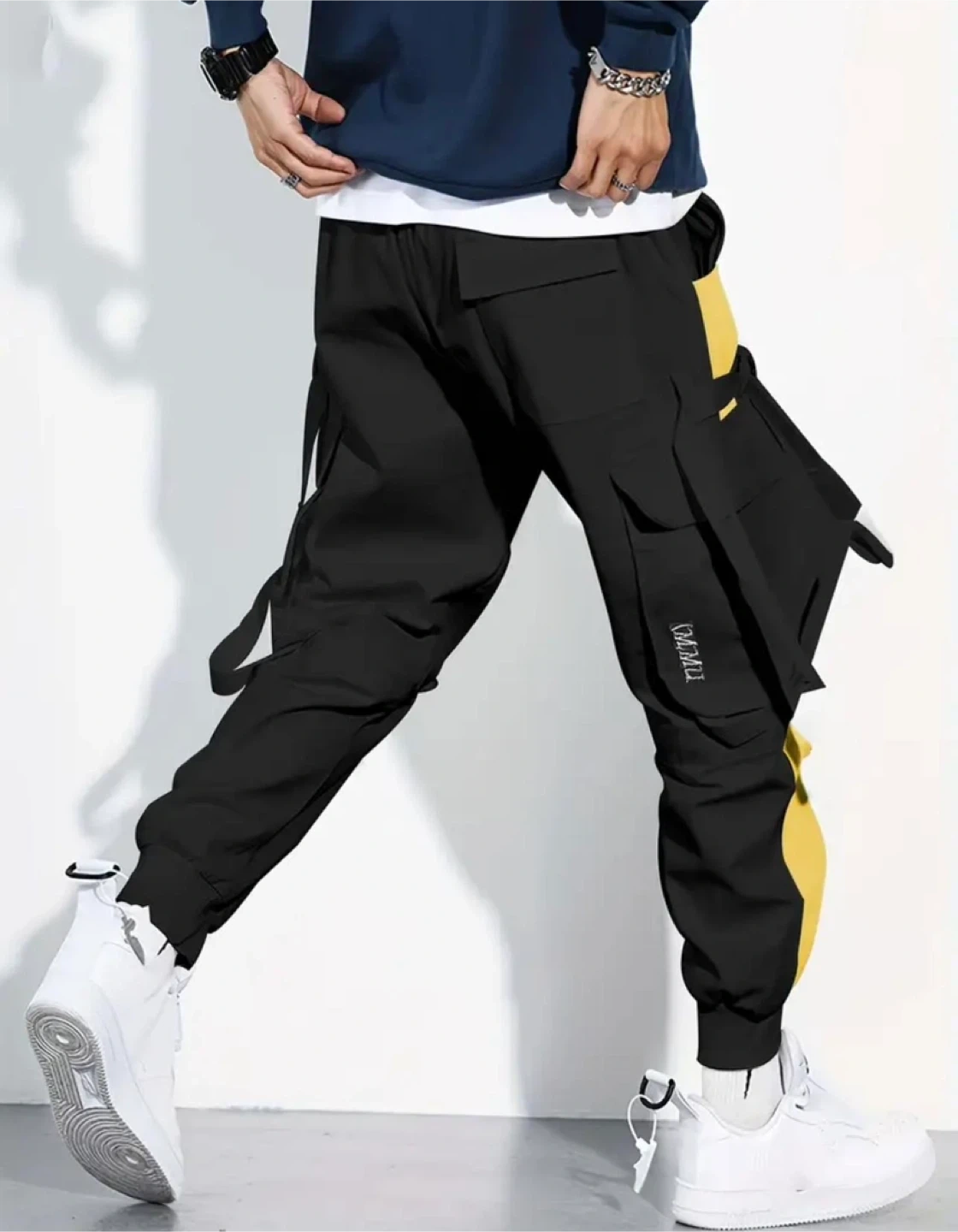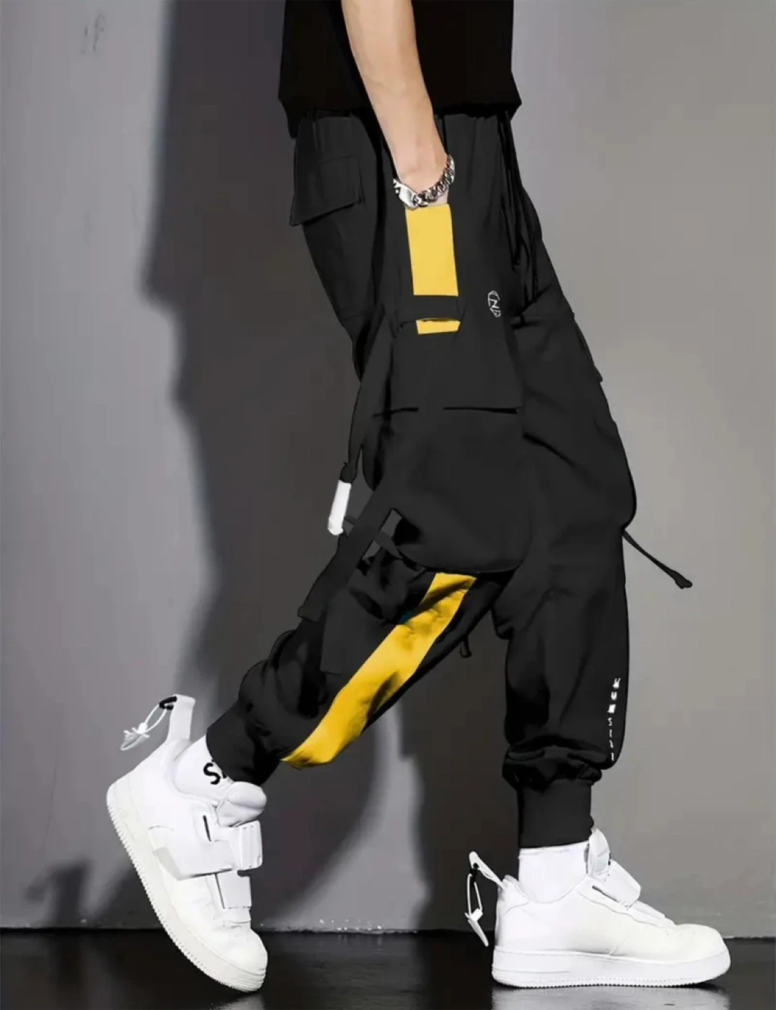 Selling a pair of black cargo pants with yellow accents. They have a unique design with multiple pockets and adjustable straps. These pants are stylish and comfortable, perfect for everyday wear!