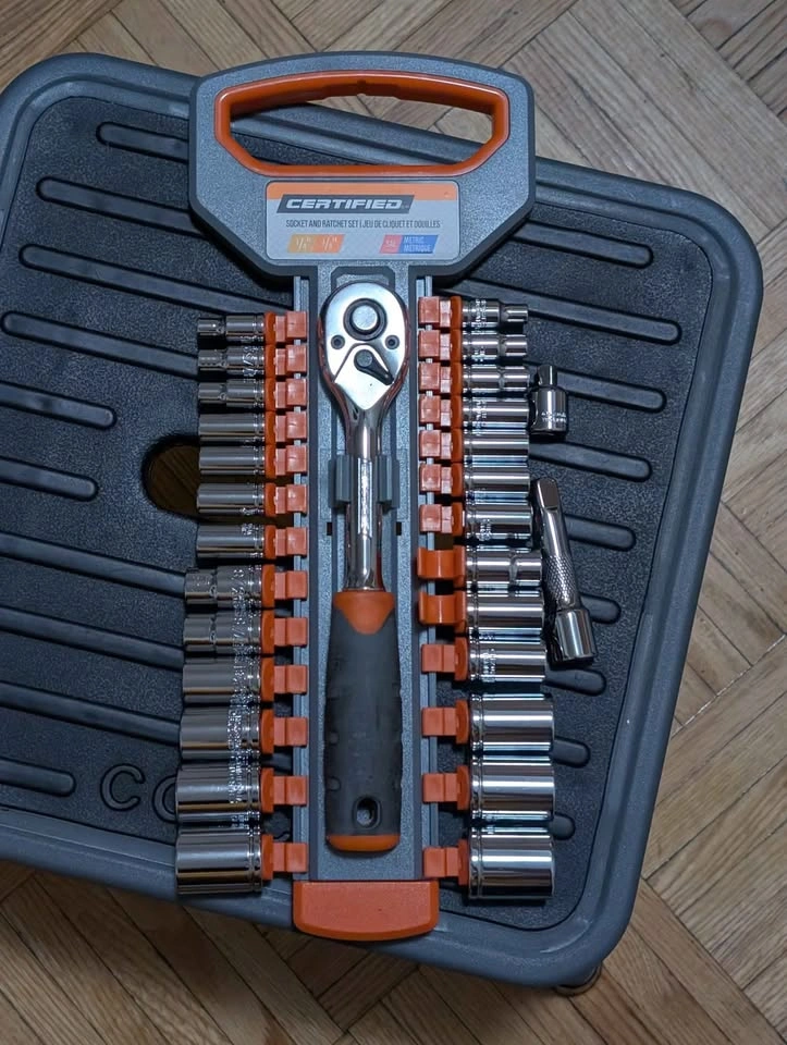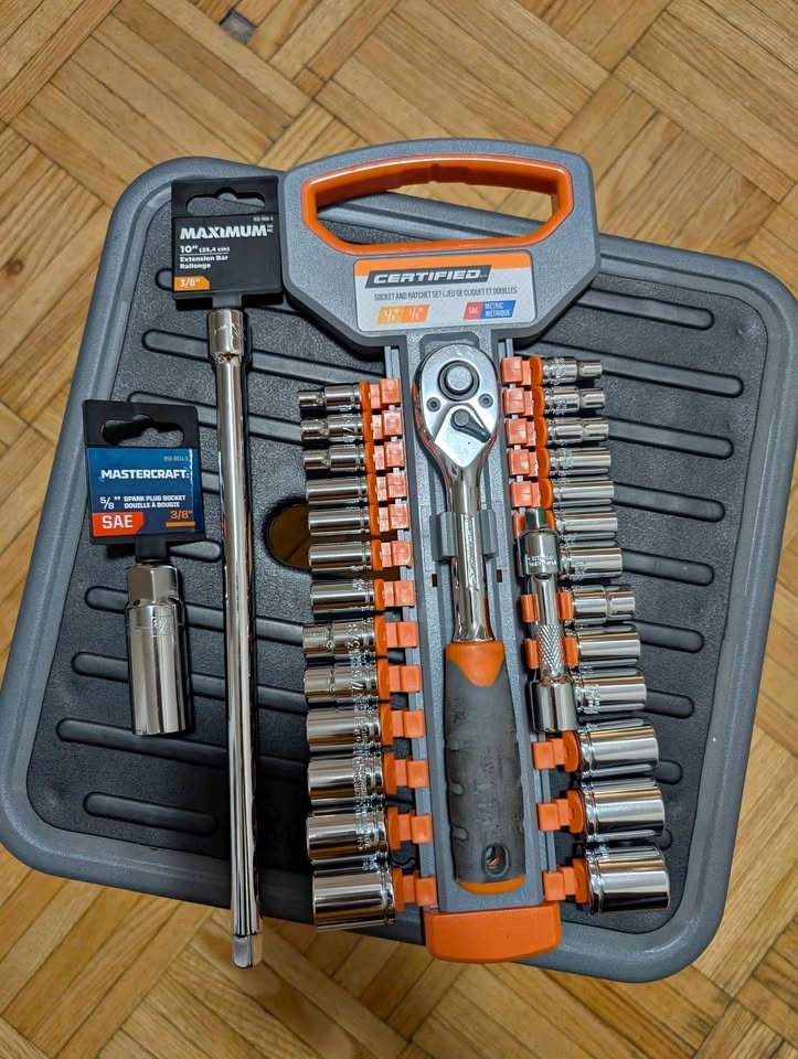 Car sockets and ratchet set Spark plug socket - SAE 3/8" Certified 29-pc Socket and Ratchet set 10" Extension bar - 3/8" Socket set details in second photo. Used just once Pickup near Keele and Finch DM for details!