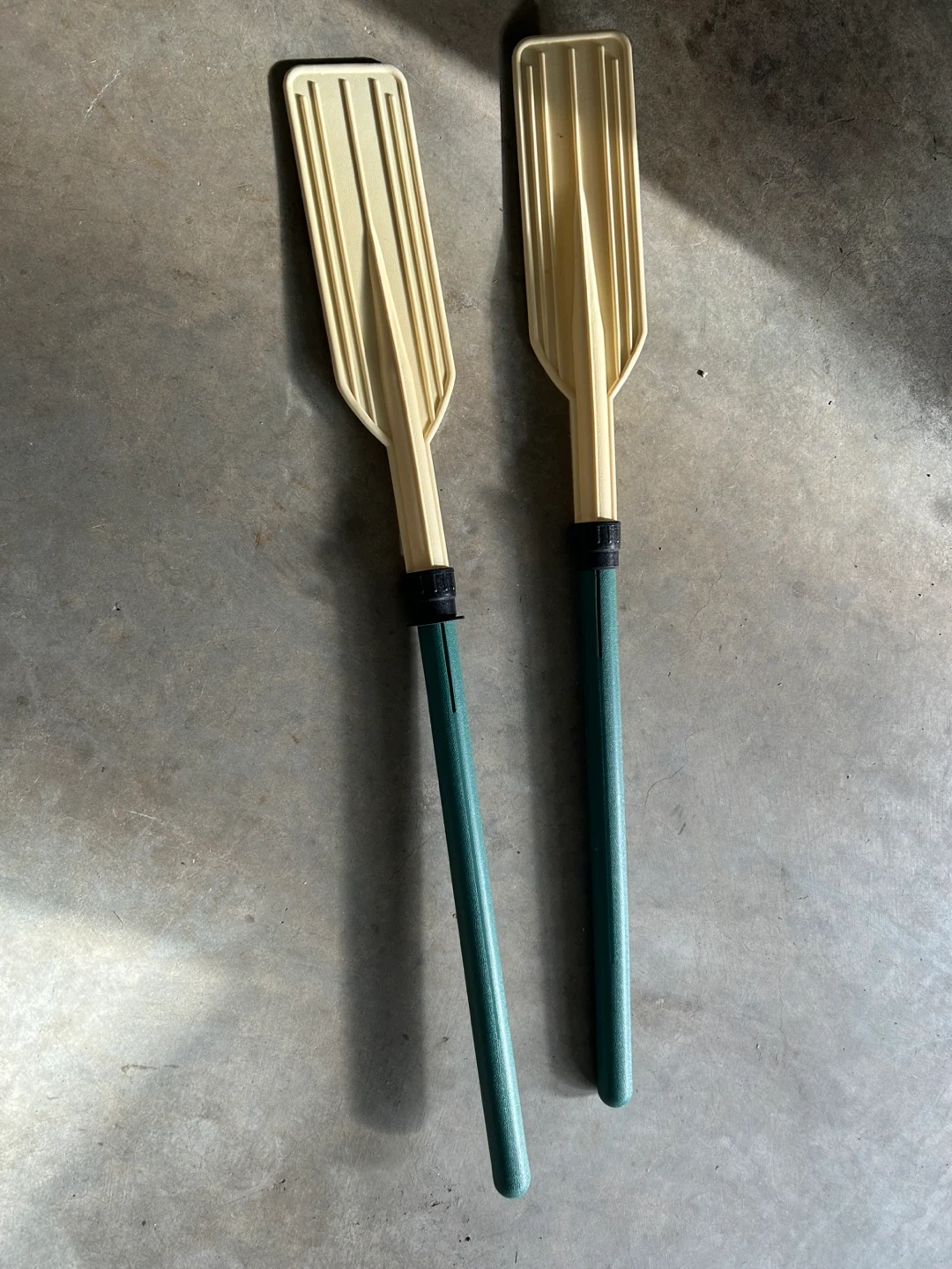 Selling a pair of paddles, perfect for kayaking or canoeing! They are in great shape and ready for your next water adventure. The paddles have a beige blade and a green handle.